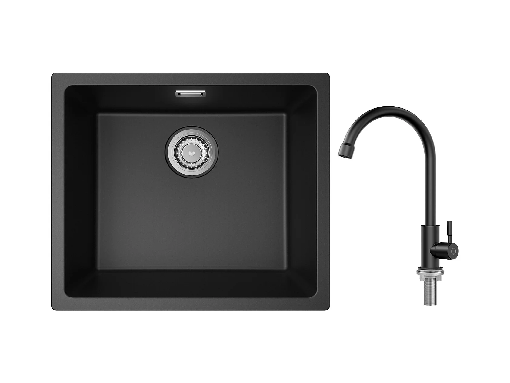 1-kom kwarts- en harsgootsteen, 3 montageopties, 50 * 44 * 20 cm + koudwaterkeukenkraan, zwart