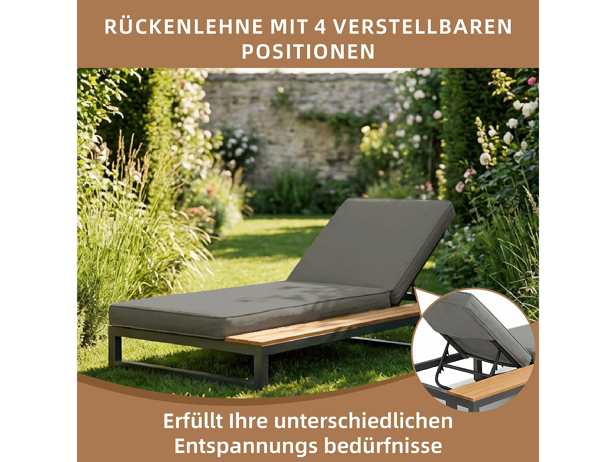 1-persoons ligstoel voor buiten - 184 x 79,5 x 73 cm - Daybed met plank aan de linkerkant - verstelbare rugleuning - metaal + hout - grijs
