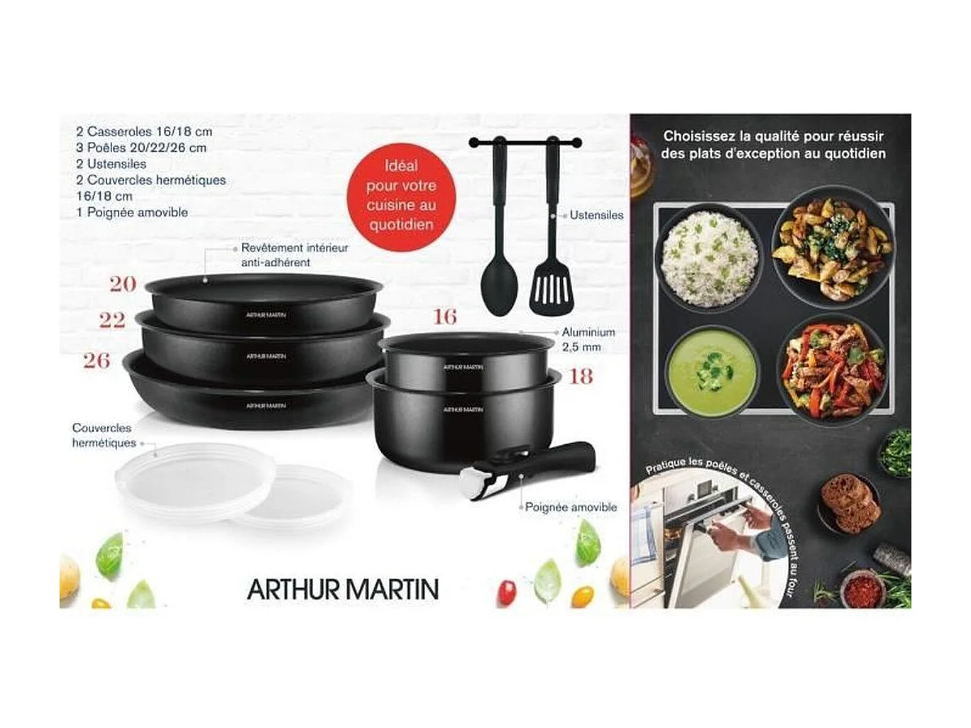 Arthur Martin AM558 inductiekookset 20-delig aluminium 2,5 mm met afneembare handgreep en luchtdichte deksels