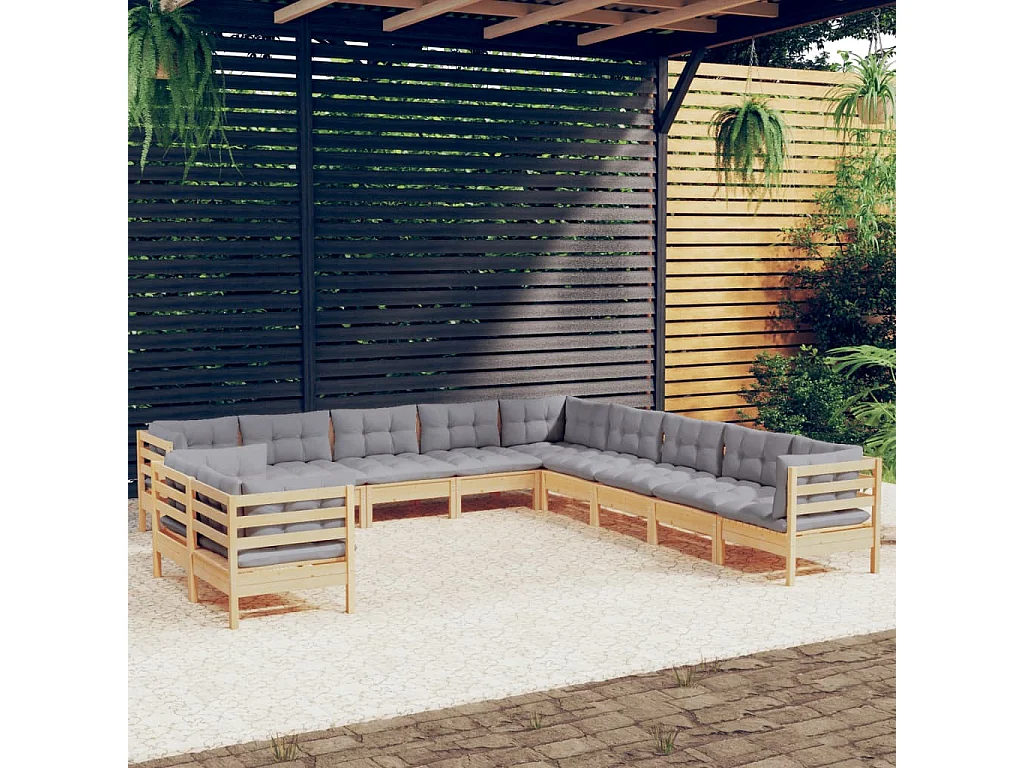 11-delige Loungeset met grijze kussens massief grenenhout