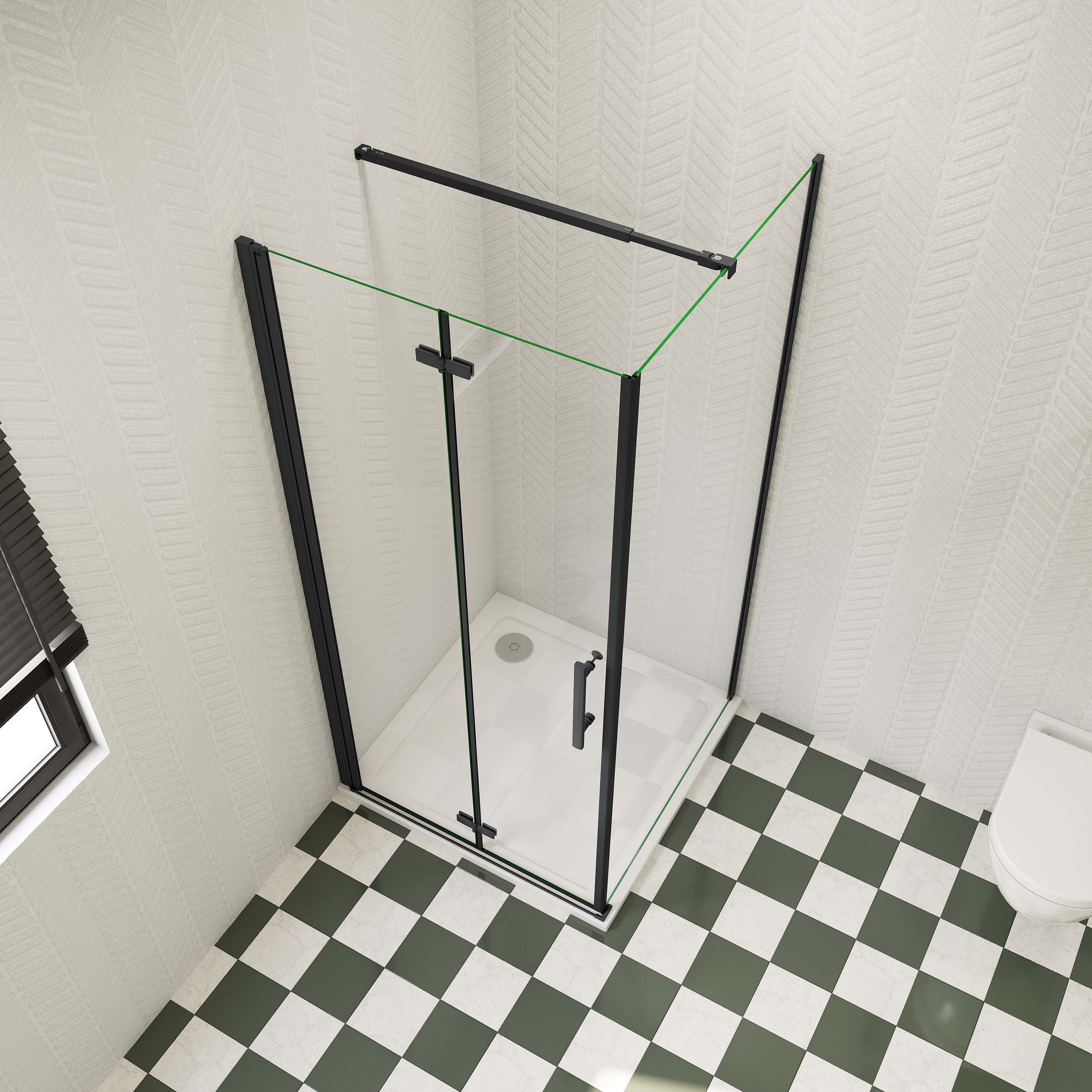 110x80x195cm douchecabine met inklapbare vouwdeur en vaste zijwand, 6mm helder EasyClean veiligheidsglas,mat zwarte aluminium frame, stabilisatiestang 73-120 cm
