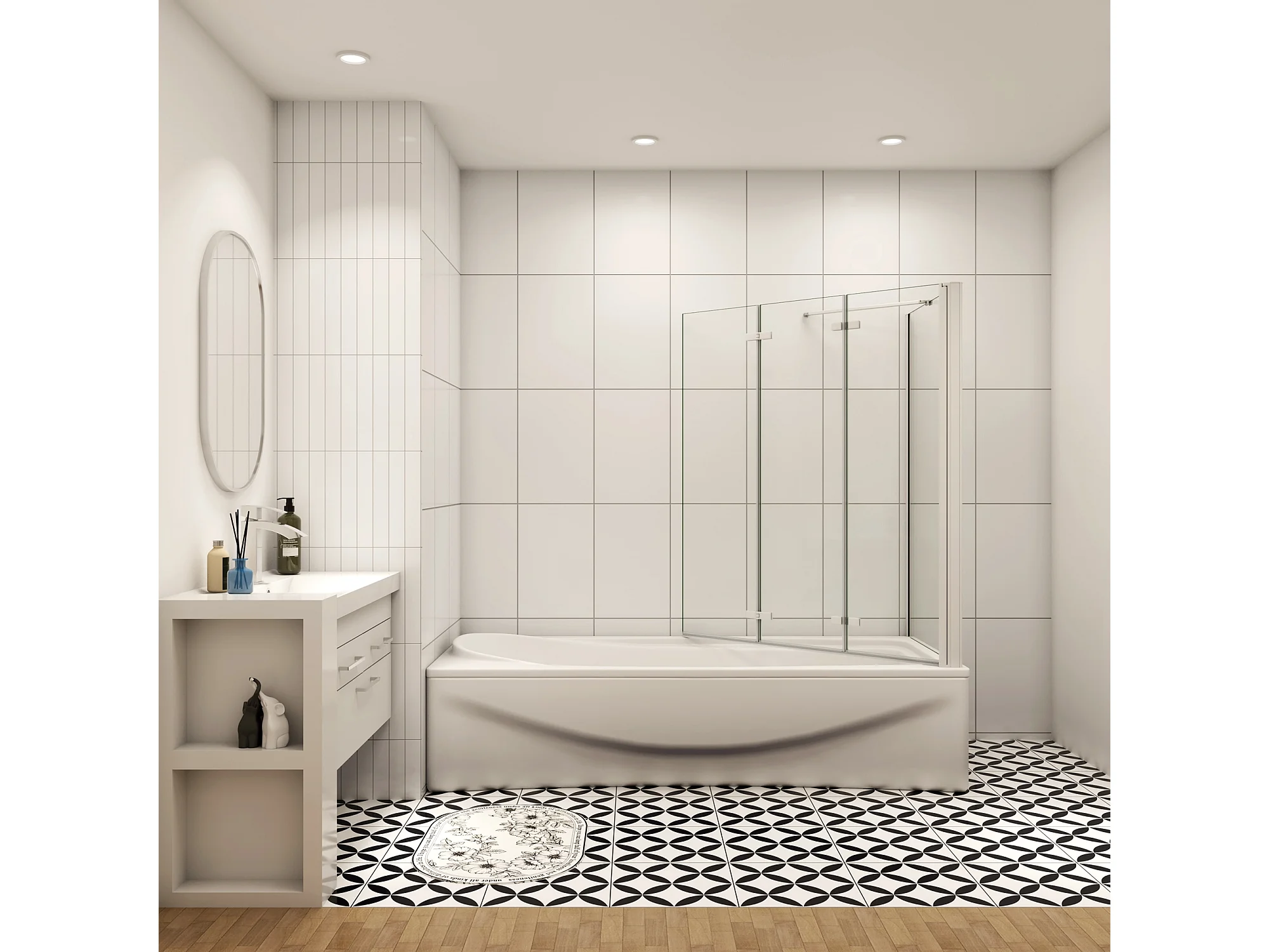 130x75x140cm Badscherm badwand 3 panelen vouwbaar met vast zijwand,6mm NANO helder ESG-veiligheidsglas - mat wit profiel