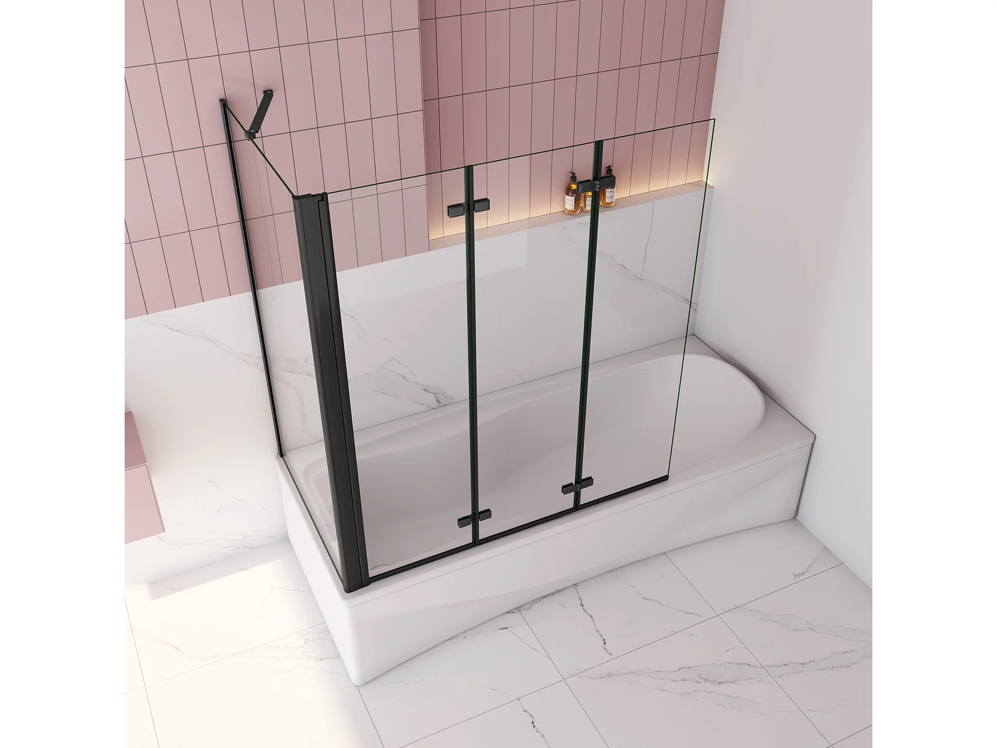 Badwand 3 panelen vouwbaar 100x140cm en zijwand 75cm,4mm NANO helder veiligheidsglas,mat zwarte profiel - linkerkant installeren