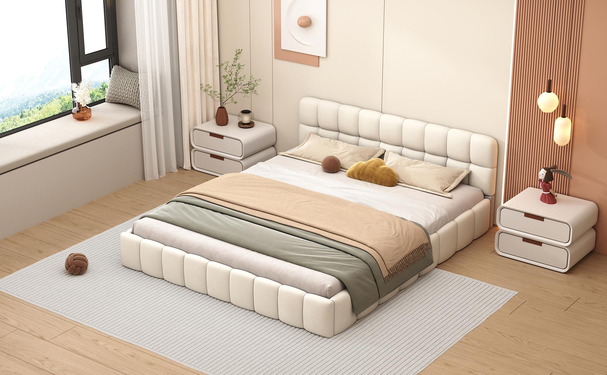 140 x 190 cm gestoffeerd bed, jeugdbed, tweepersoonsbed met zachte rugleuning en gewatteerde rand, beige linnen lattenbodem (matras niet inbegrepen)