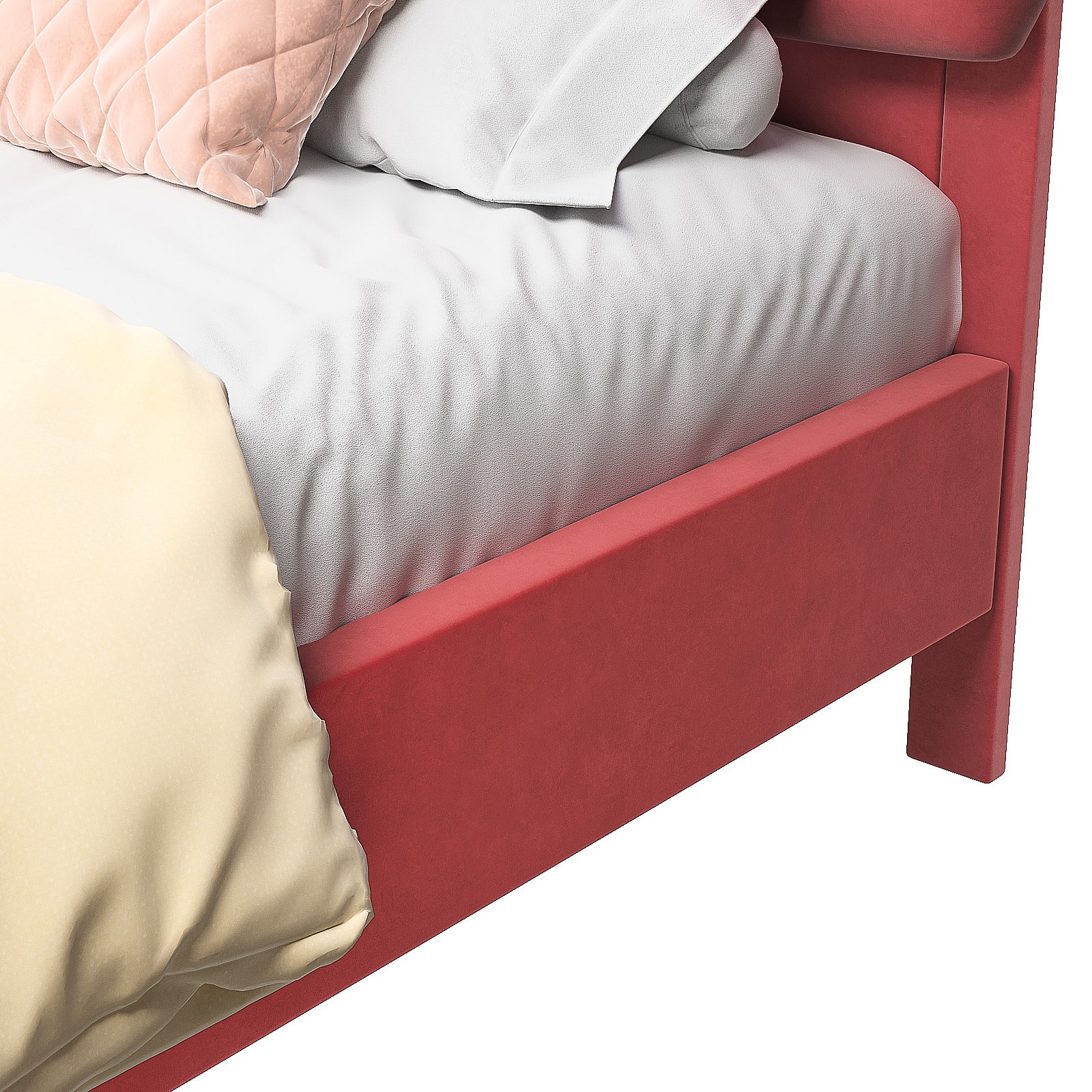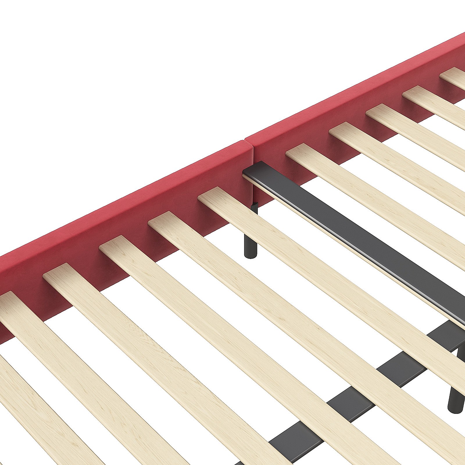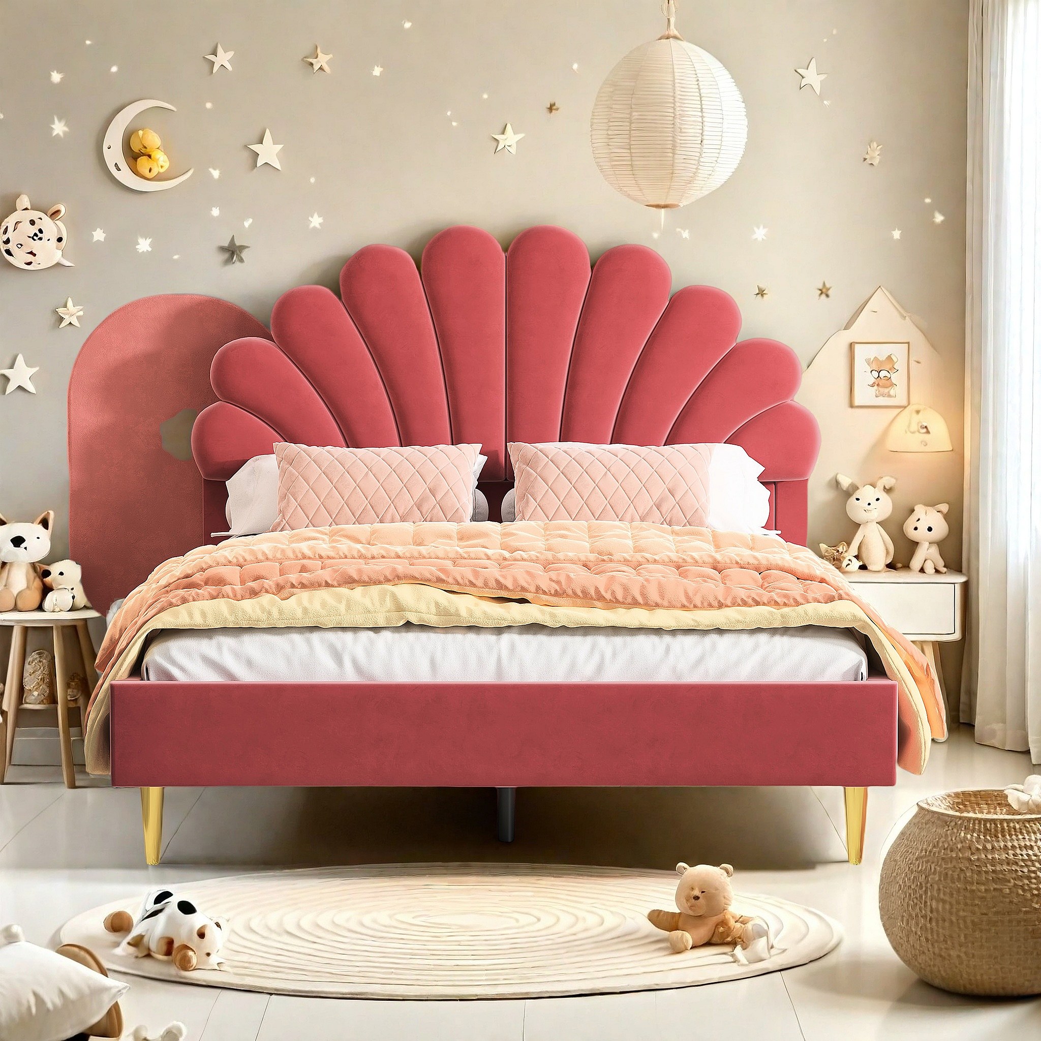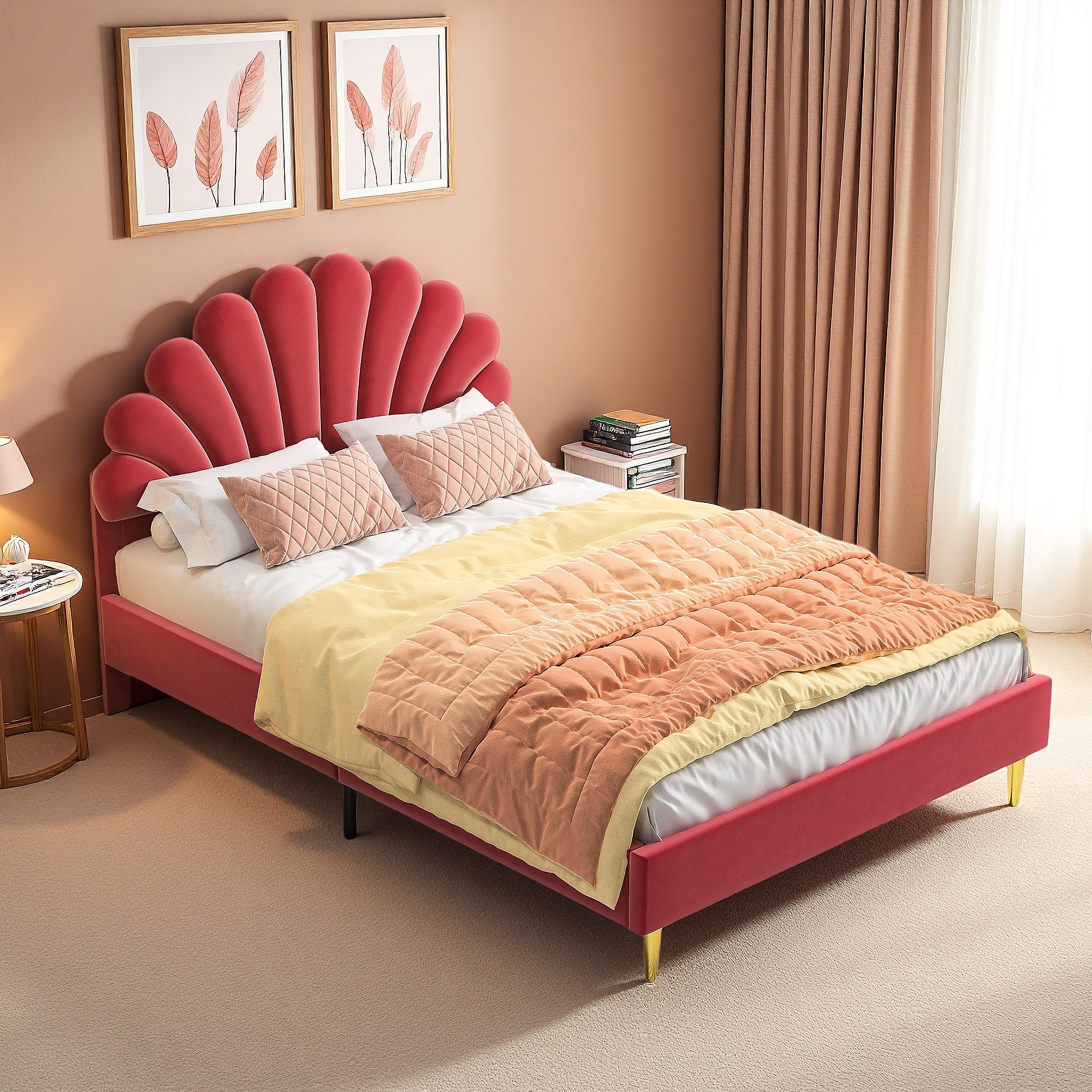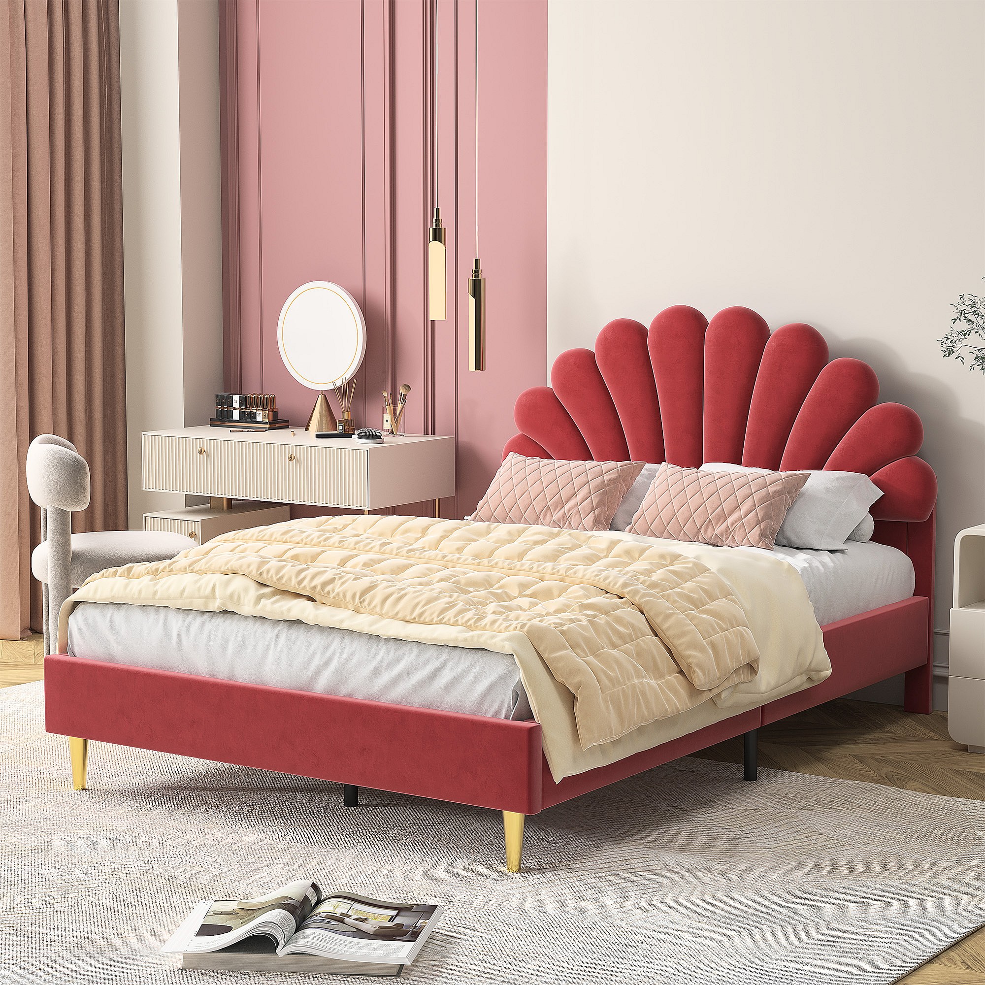 140x190 cm fluwelen gestoffeerd tweepersoonsbed, bloemblaadjesvormig bed, gouden ijzeren poten, houten onderstel, rood