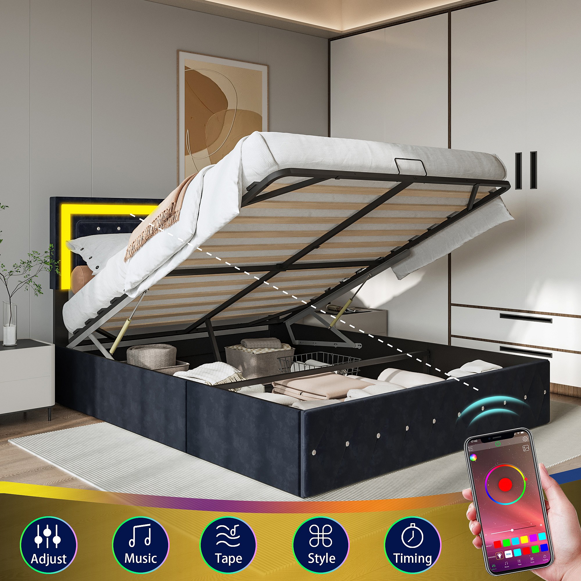 140x200 cm fluwelen opbergbed - met LED en lattenbodem - Tweepersoonsbed met opbergruimte - Zwart