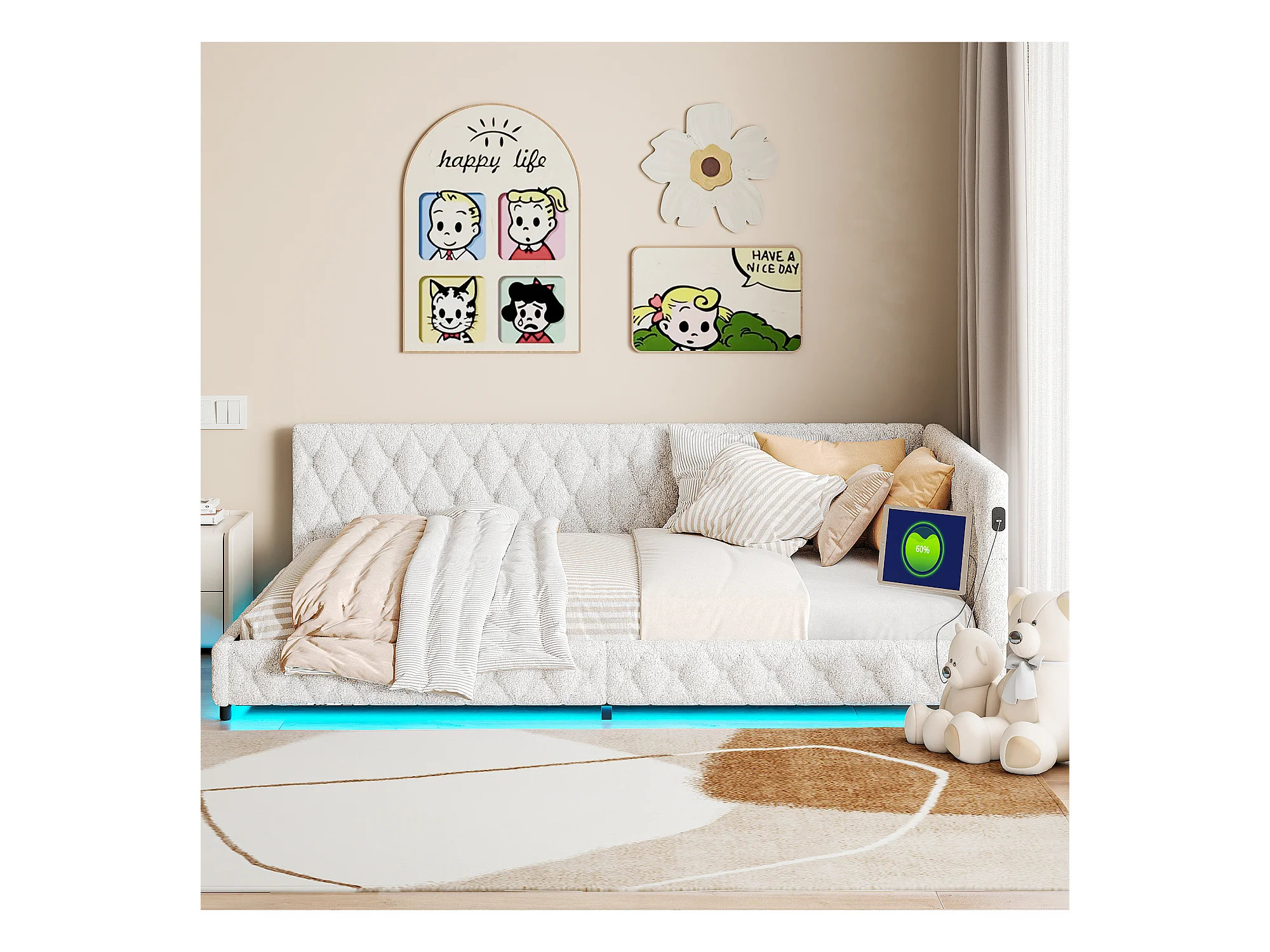 140x200 cm fluwelen tweepersoonsbed met LED en USB, lattenbodem, beige