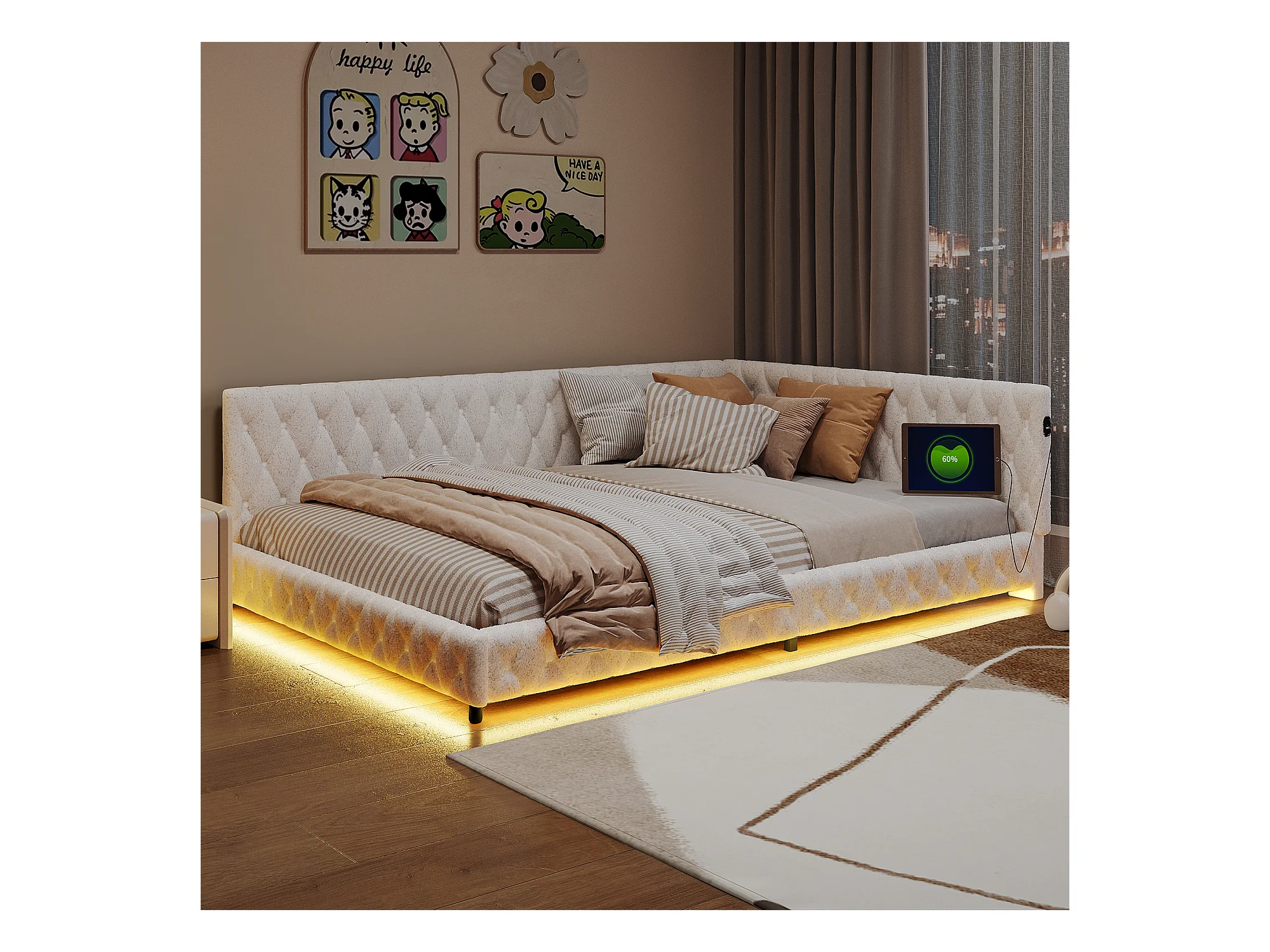 Vrijhangend gestoffeerd bed 140*200, linnen, met LED-verlichting, USB-aansluiting en TYPE-C, beige