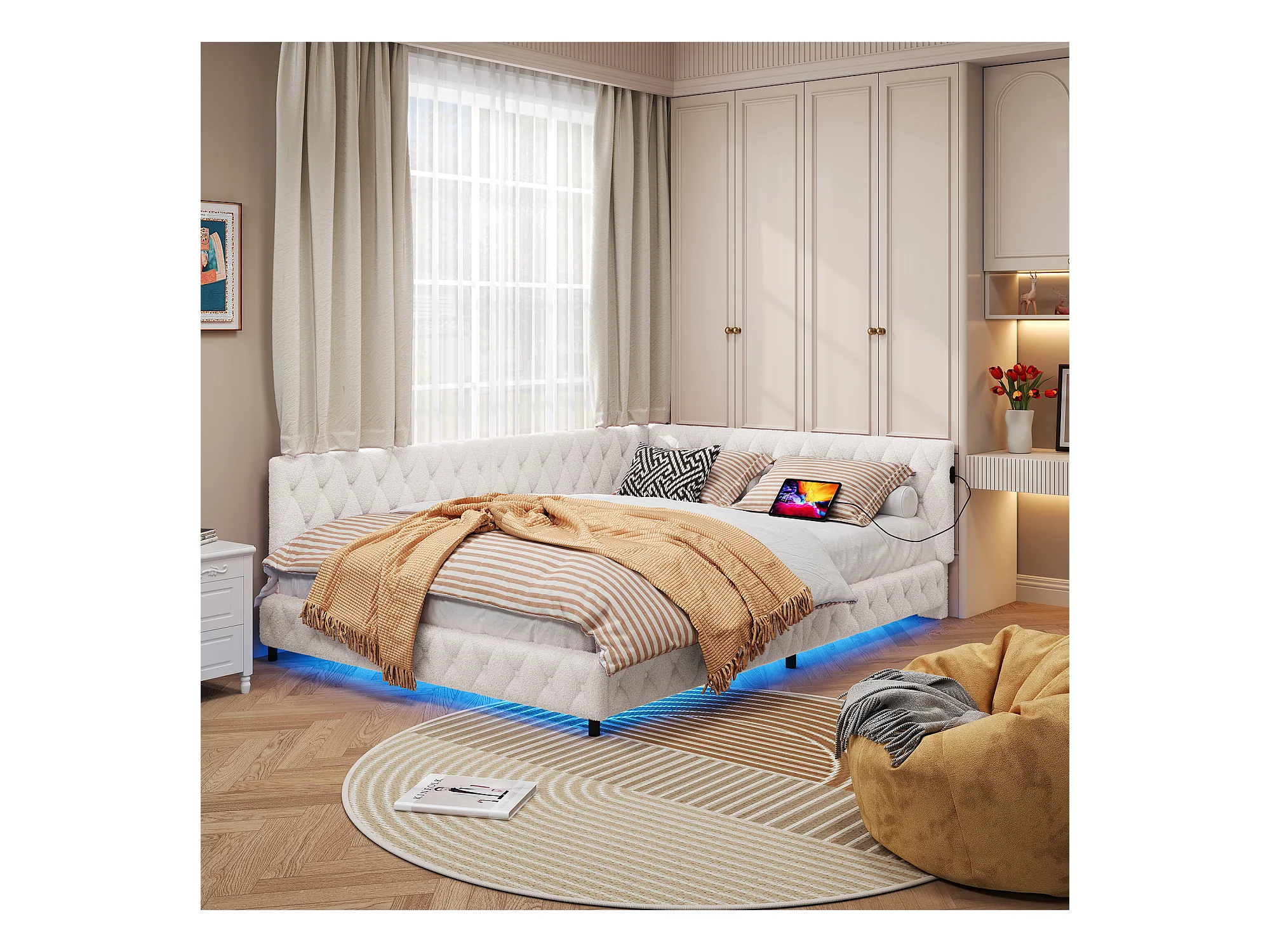 Gestoffeerd bed, slaapbank 140*200 met LED-hoofdband, beige USB-aansluiting