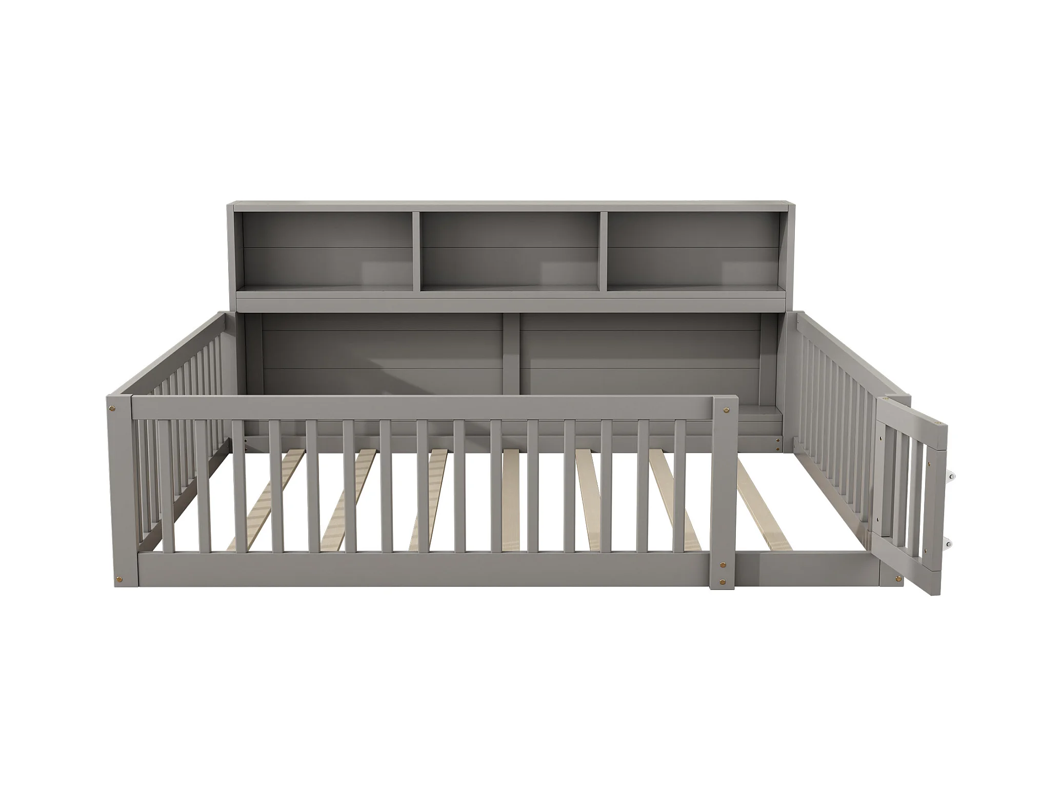 Kinderbed 140x200 cm, massief houten frame, huisbed met planken, opbergruimte, uitvalbeveiliging, deur, boekenplank, lattenbodem, grijs