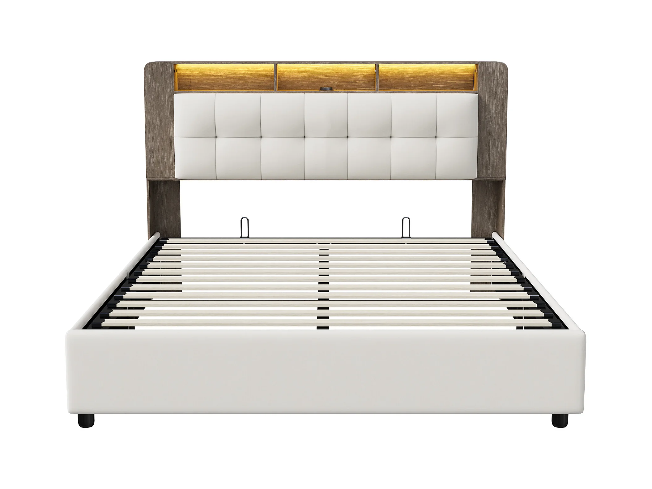 140x200 opbergbed met LED en draadloze oplaadfunctie, met opbergruimte, fluweel, wit