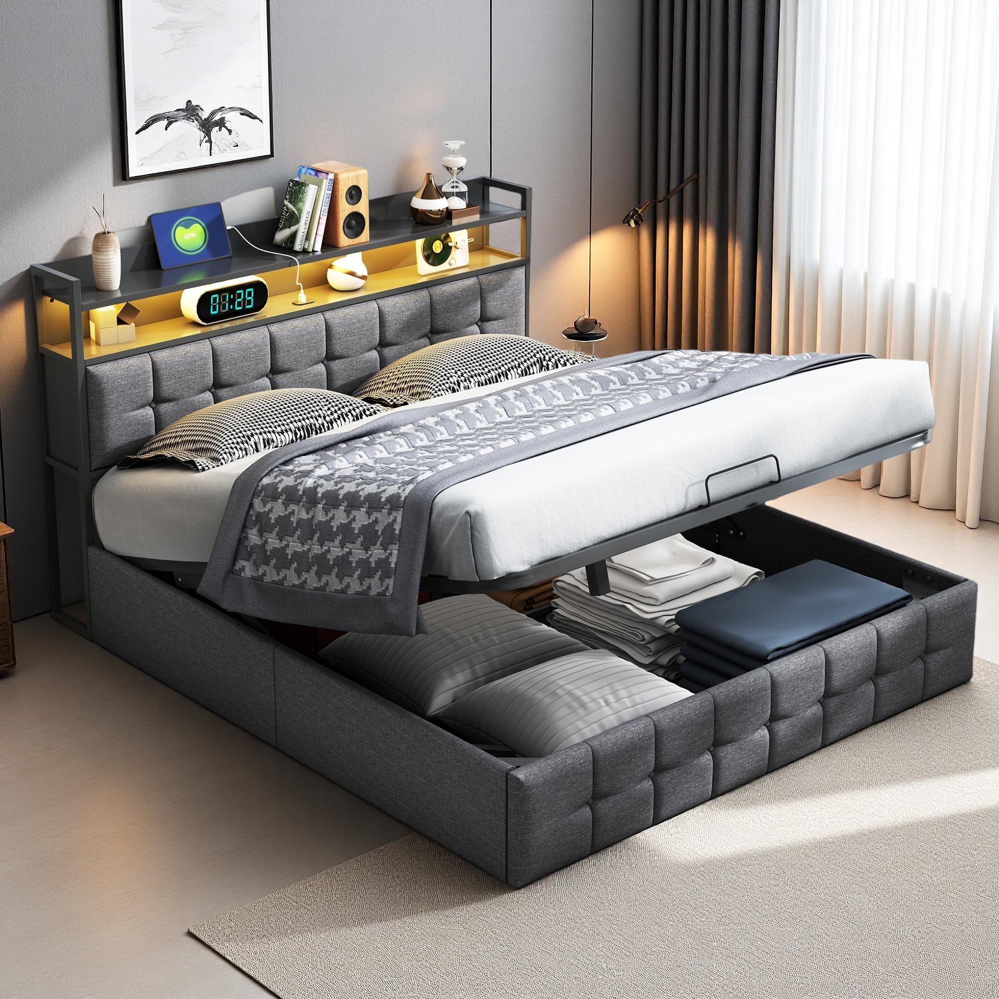 140x200cm opbergbed in grijze stof met lattenbodem, led-verlicht hoofdbord, geïntegreerde EU-stekker, modern en praktisch design