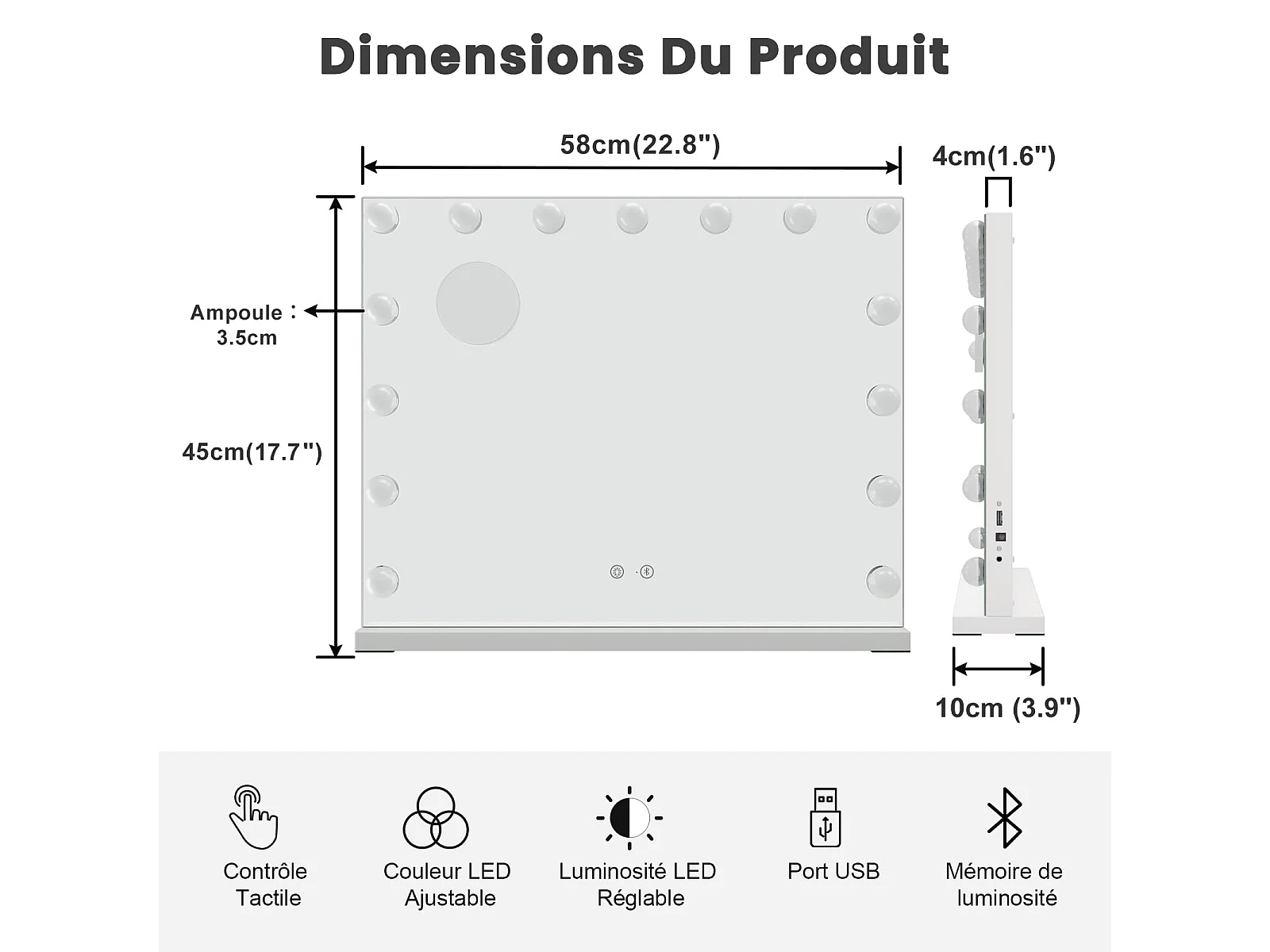 15 LED verlichte make-upspiegel met Bluetooth, Hollywood make-upspiegel met Touchbediening, instelbare helderheid, 58 x 45 cm - Wit
