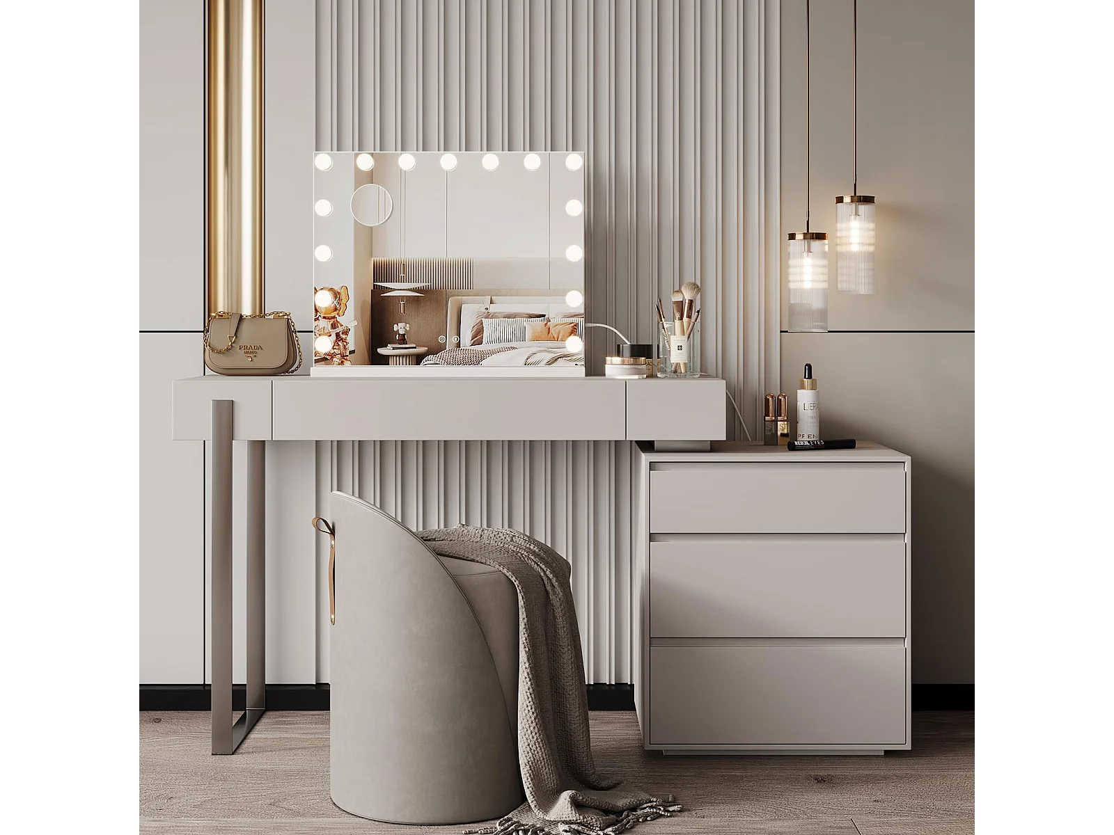 Kaptafel met 3-kleurige LED-spiegel, instelbare helderheid, geïntegreerde stekkerdoos, 1 grote lade, 2 3-laags zijkasten, 110x40x135cm, wit