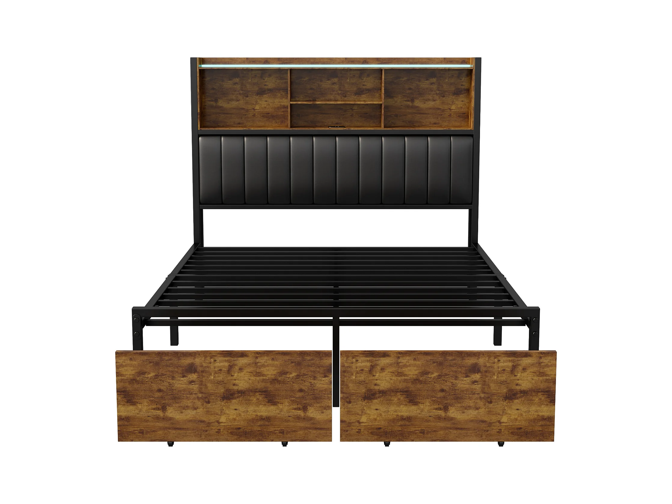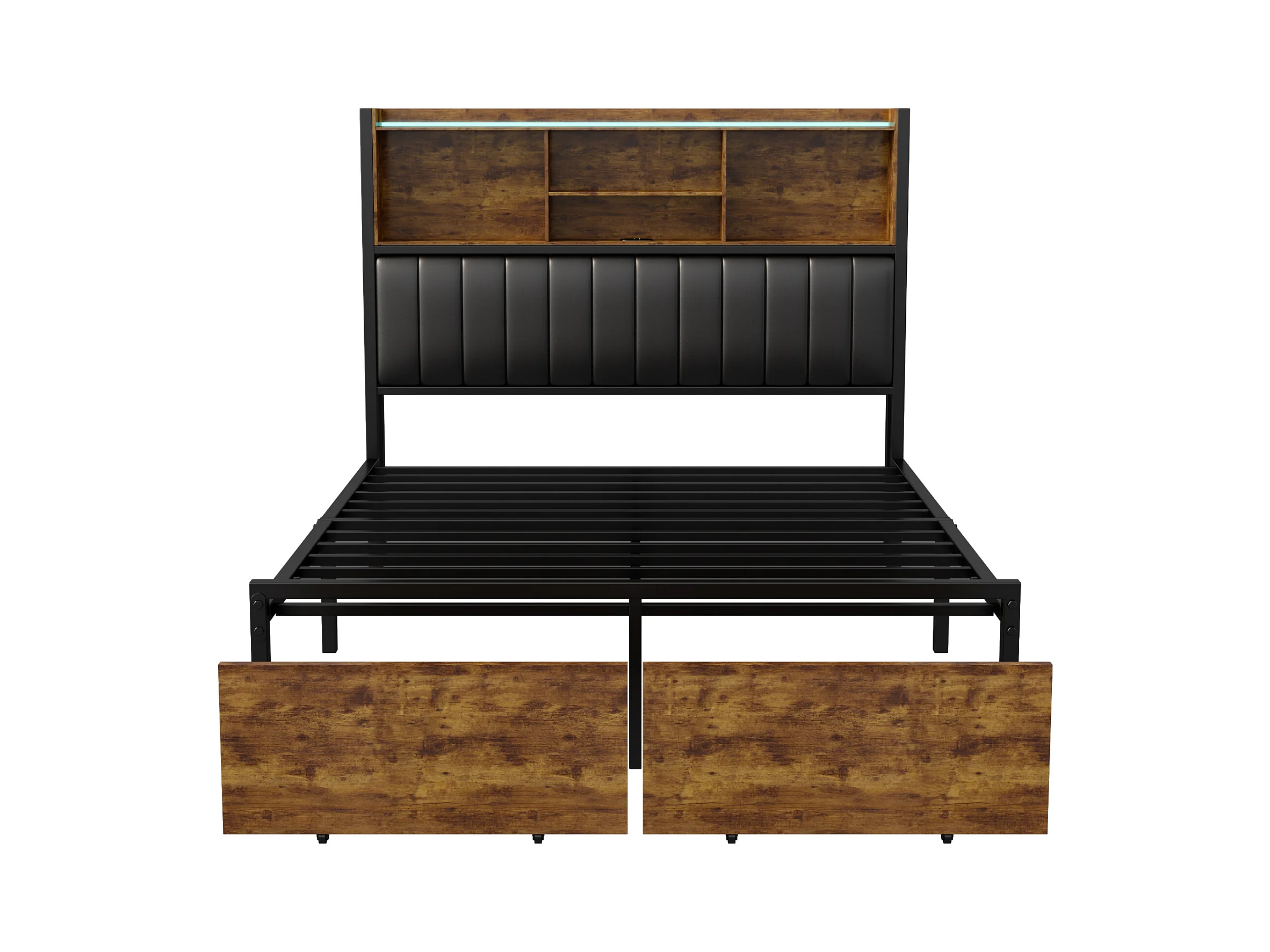 160*200CM ijzeren houten bed, zachte sprei en LED-lichtstrip, met USB-aansluiting, dubbele lades, massief houten kleur