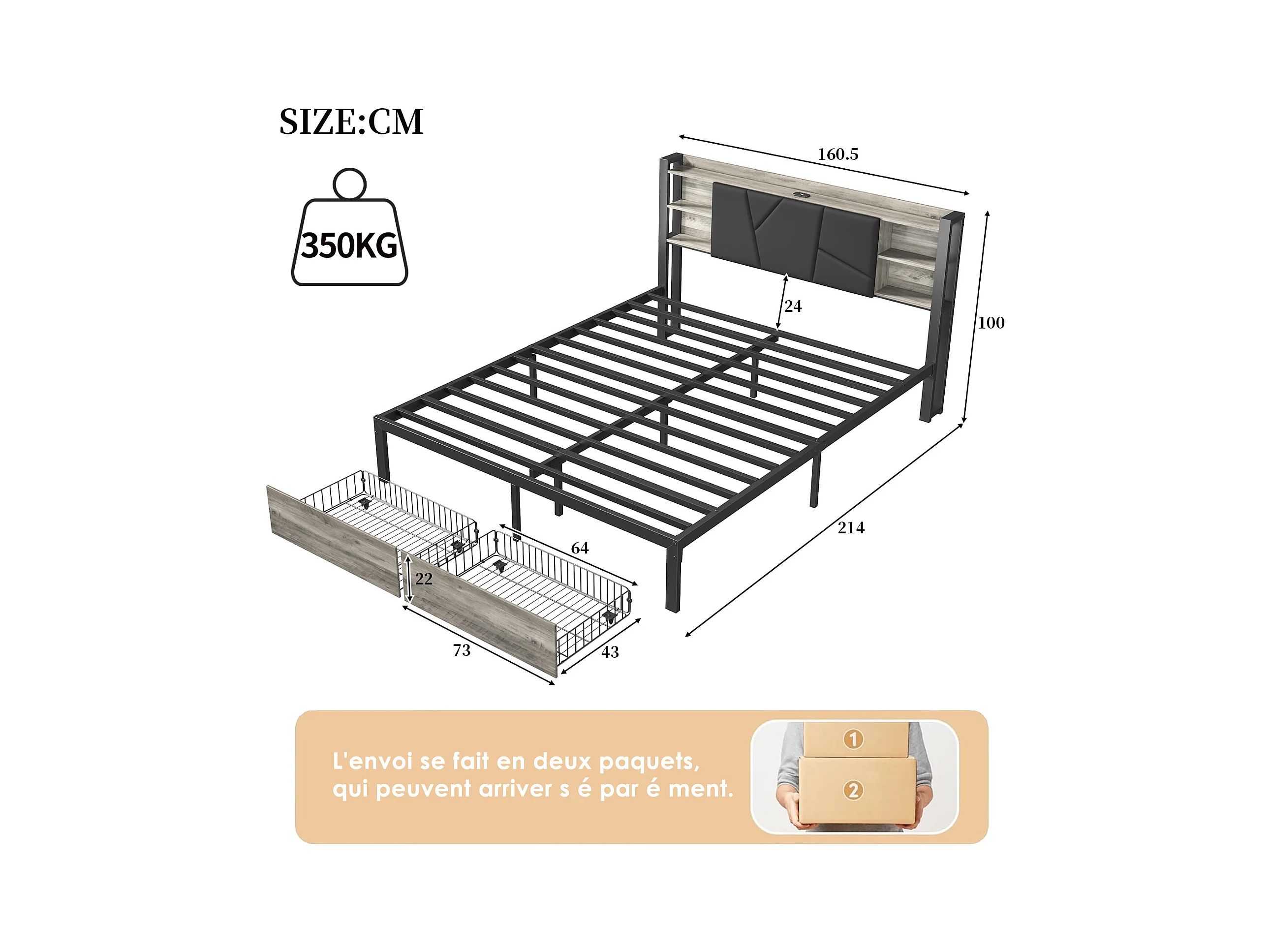 Tweepersoonsbed 160x200 cm met LED, metalen frame, 2 lades, hoofdbord met opbergruimte, lattenbodem