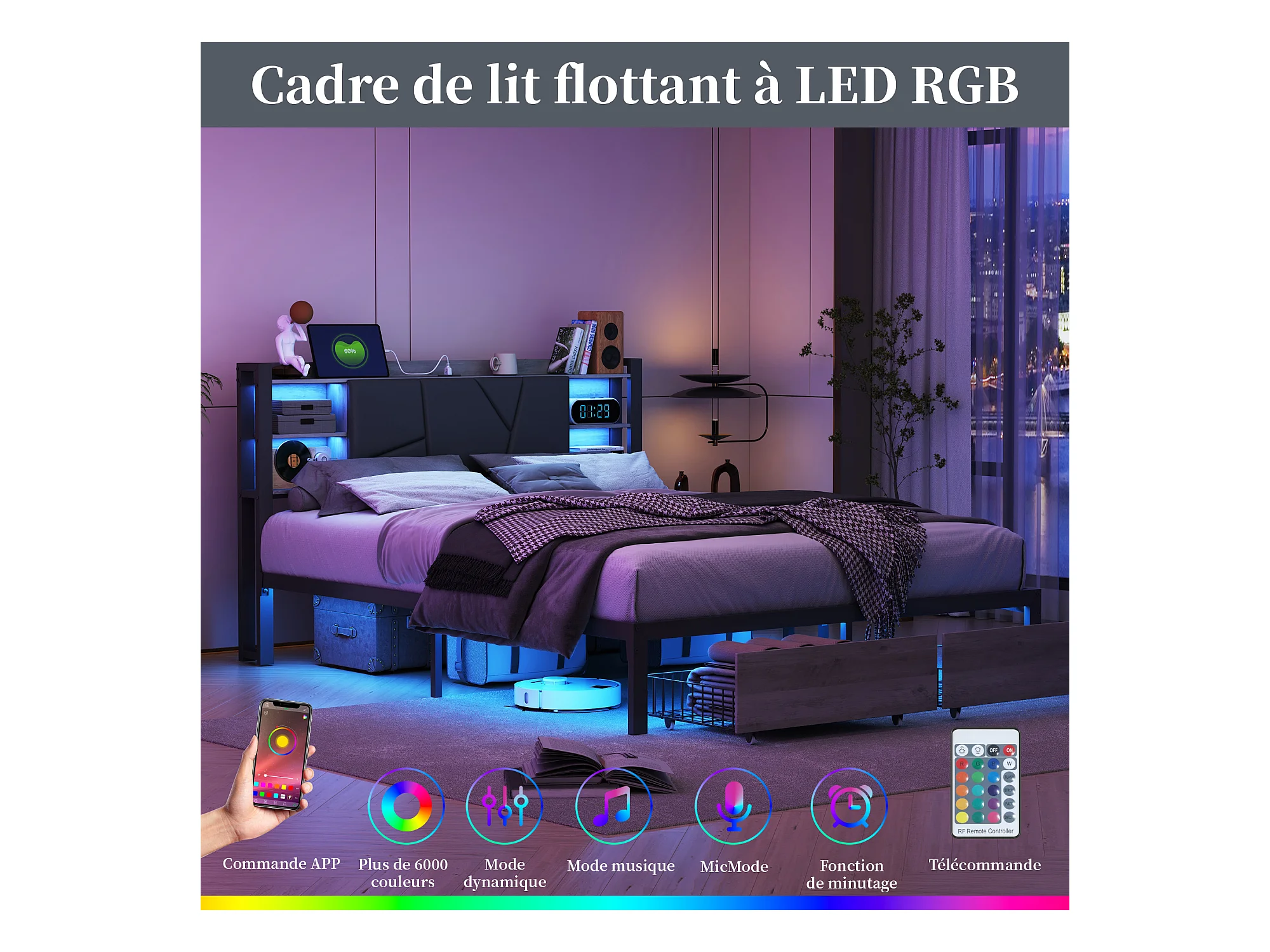 Metalen tweepersoonsbed 160x200cm met LED en USB, 4 lades, lattenbodem, zwart