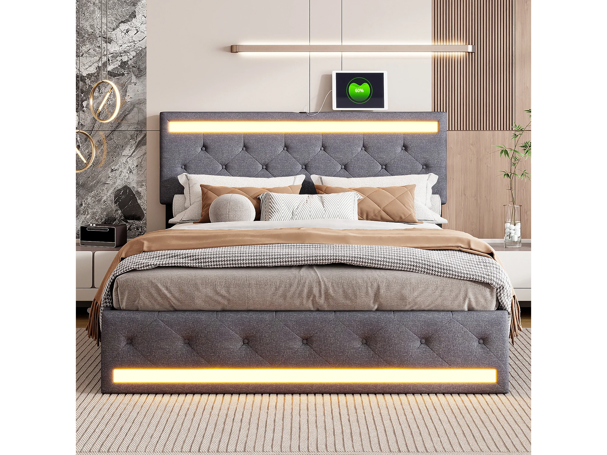 Tweepersoonsbed 160x200 cm in grijze stof met LED en USB-aansluiting - Omkeerbaar hoofdeinde, verborgen voeteneinde