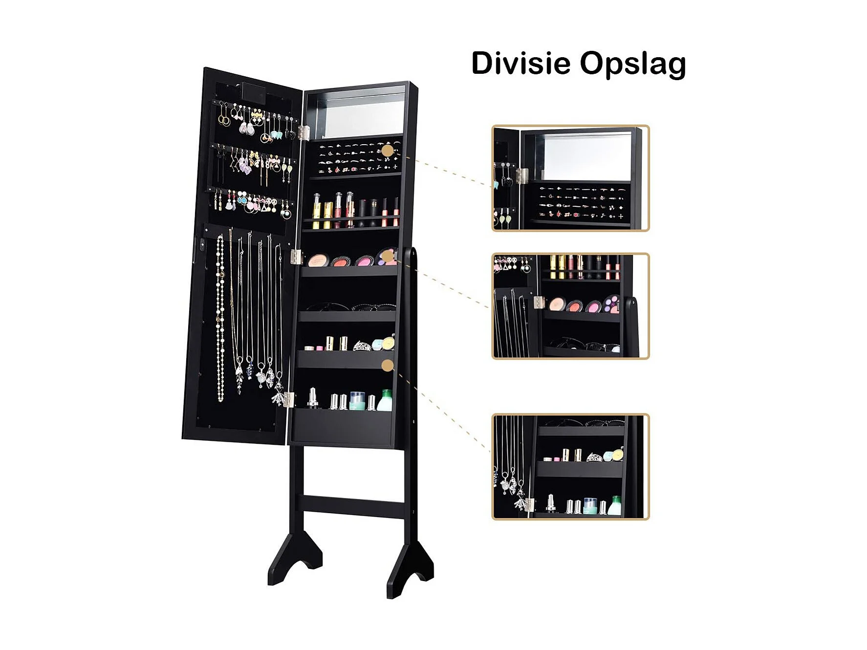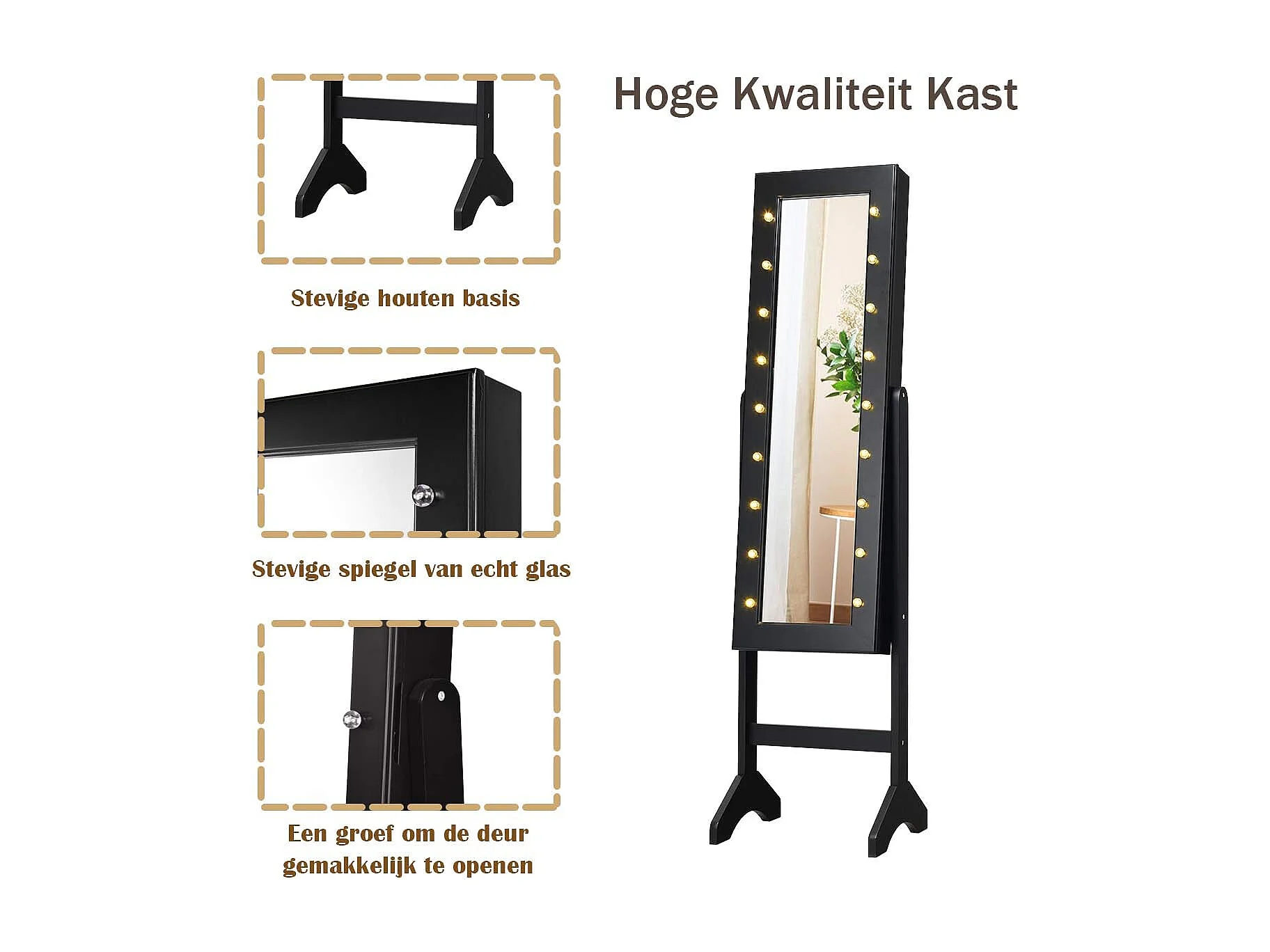 18 led-sieradenkast, kantelbaar, sieradenrek met full-body spiegel en kleine make-upspiegel, sieradenspiegelkast voor make-up (zwart)VH32202