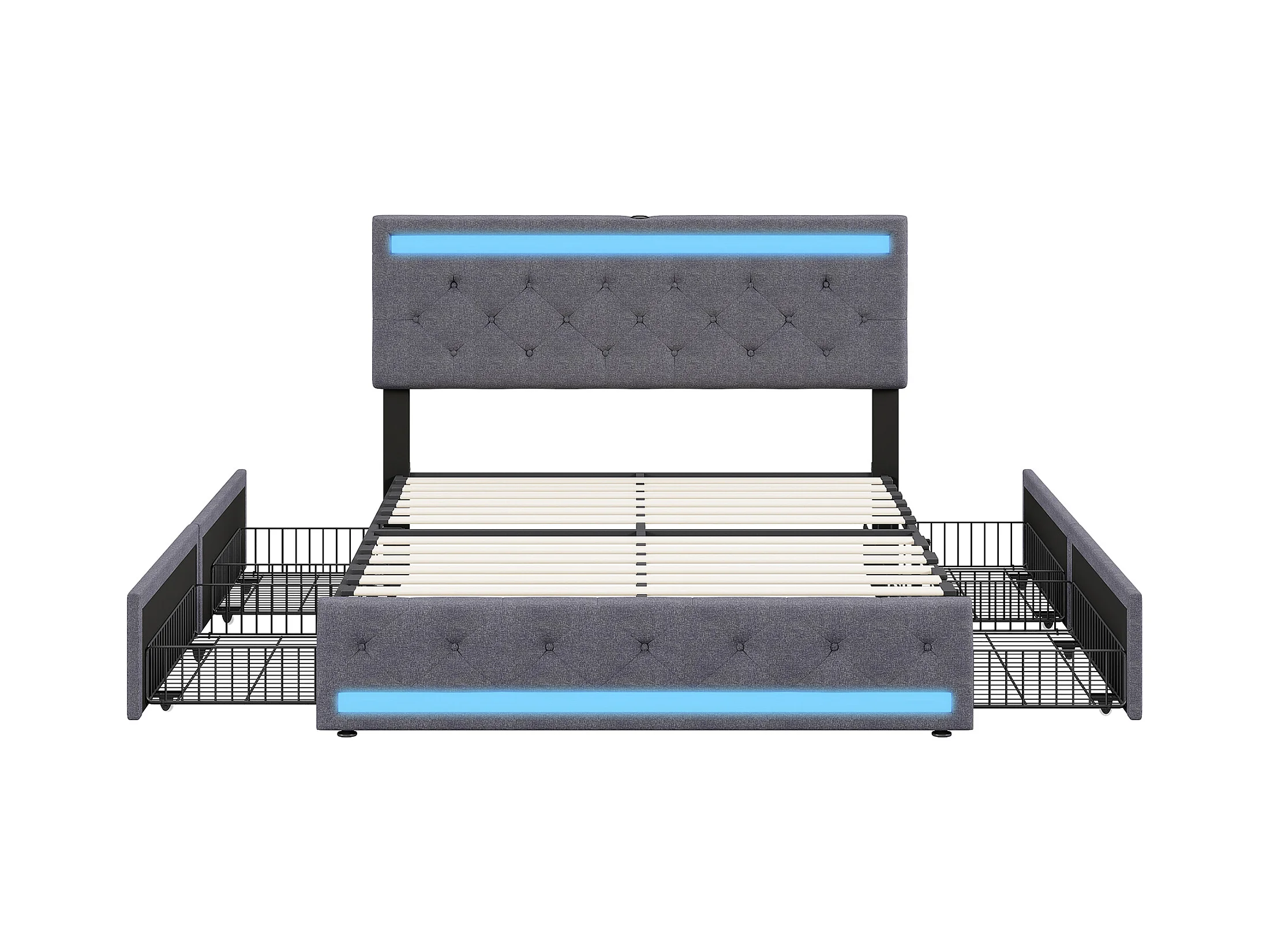 Tweepersoonsbed met lades 180x200 cm, met verstelbaar LED-hoofdbord, met USB- en Type-C-oplader, met 4 ijzeren lades, lattenbodem, metalen frame - Grijs
