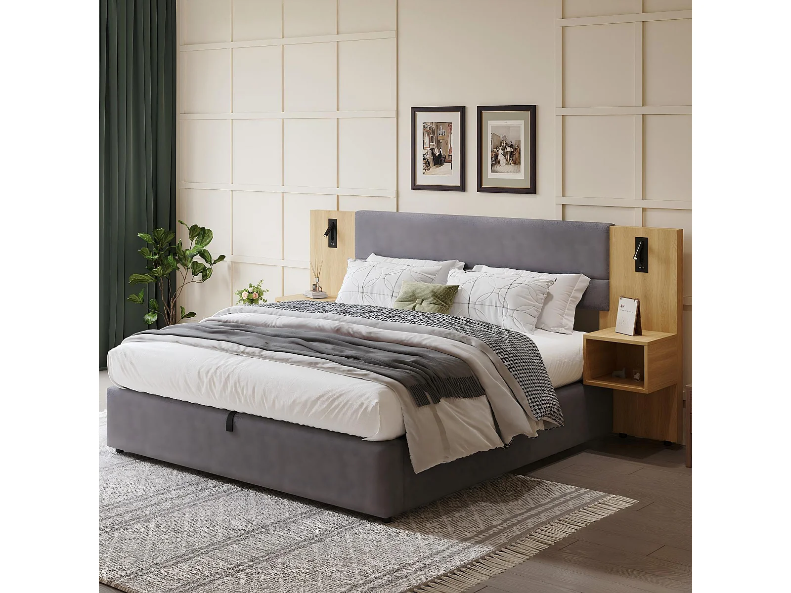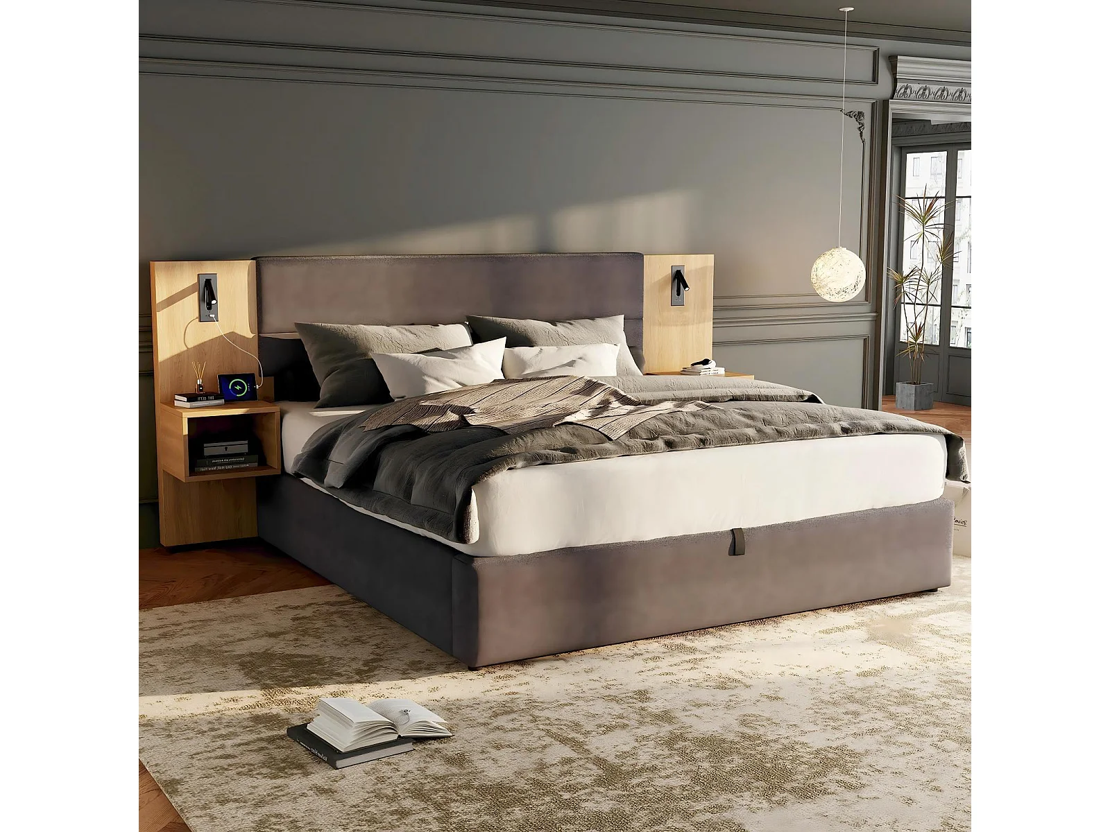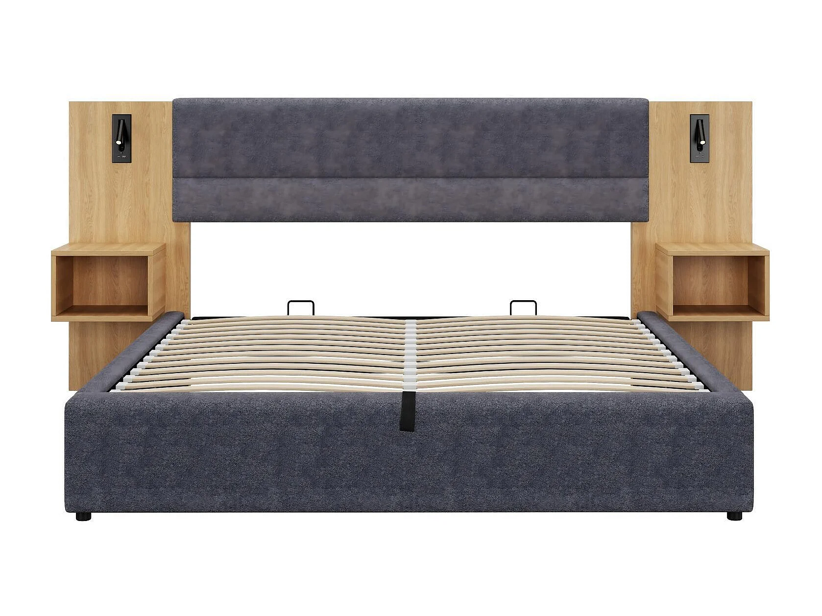 180x200cm hydraulisch borstbed, in fluweel, met nachtkastafels, LED's en USB, grijze poorten