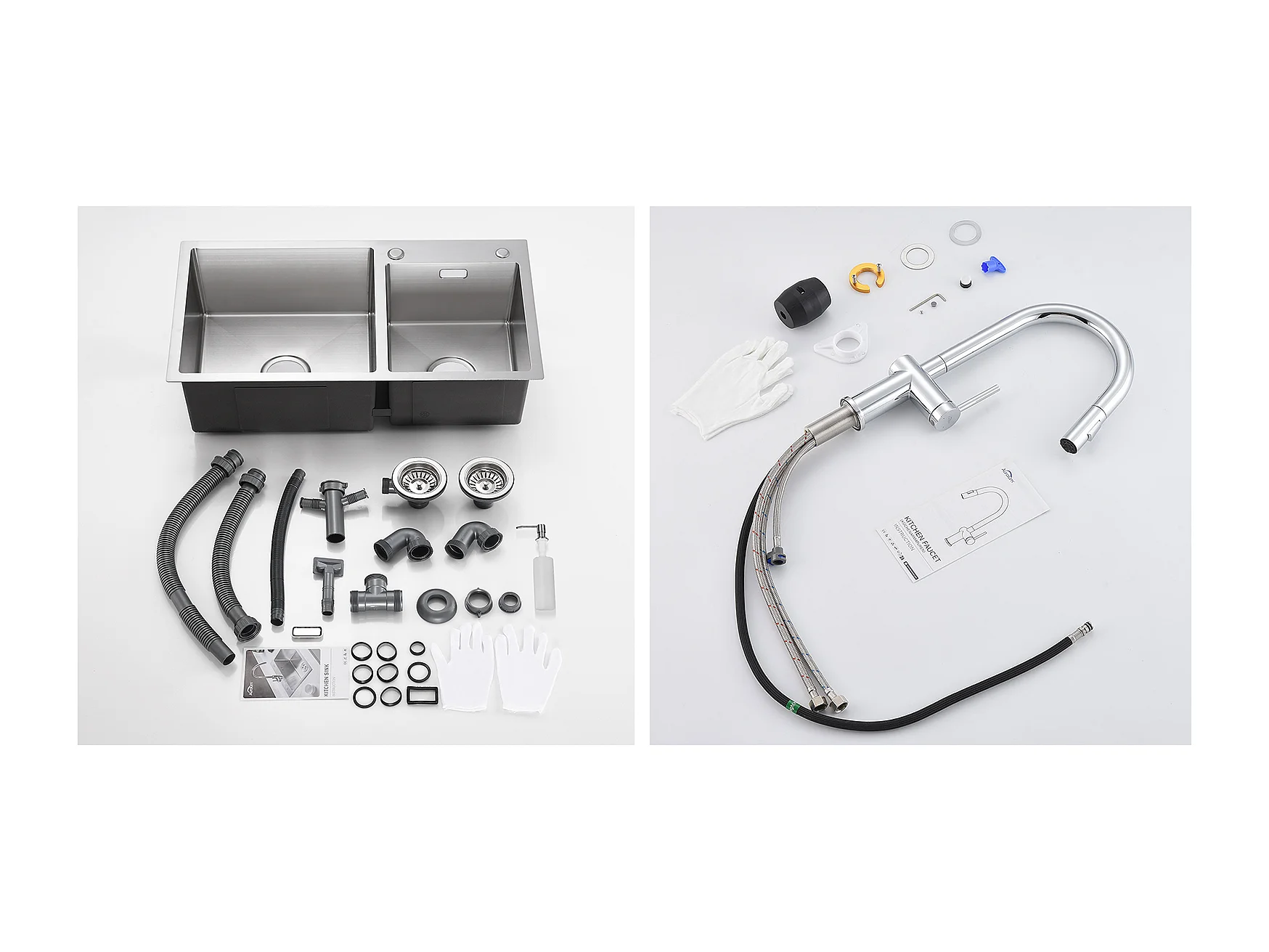 Aanrecht 2 Bak 75x45x19cm, Inbouw/ Opbouw met Zeepdispenser+ Keukenkraan met Uitschuifbare Handdouche, 2 Modi, Geborsteld