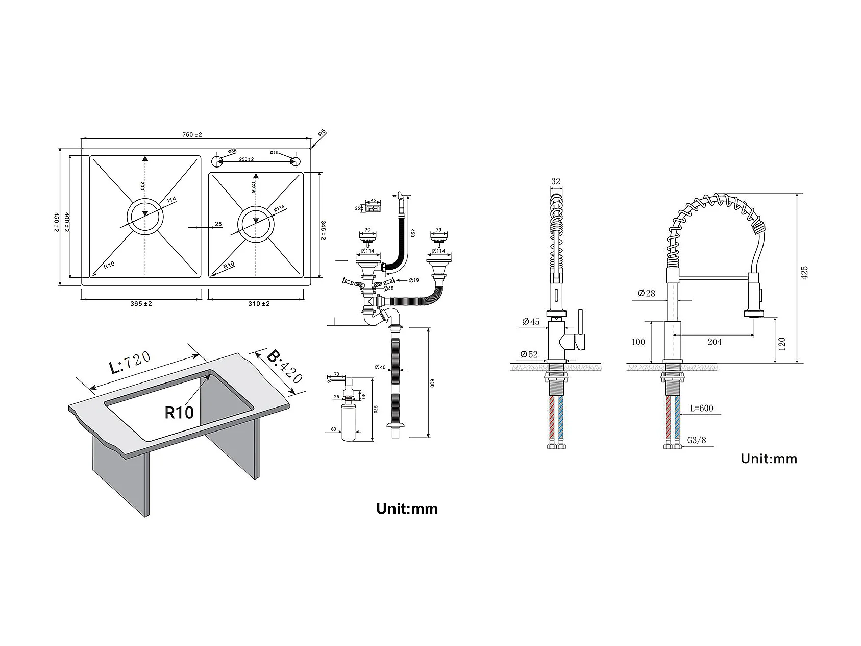 2 in 1 Aanrecht 2 Bakken ,75x45x19cm, Inbouw/ Opzetbaar met Zeepdispenser+ Keukenkraan met Uitschuifbare Douche, 2 Modi, Zwart