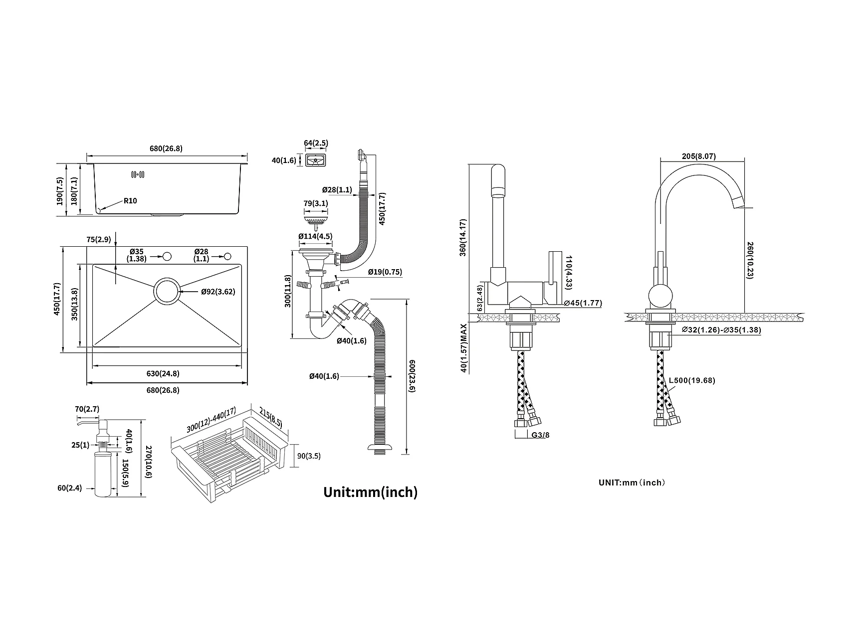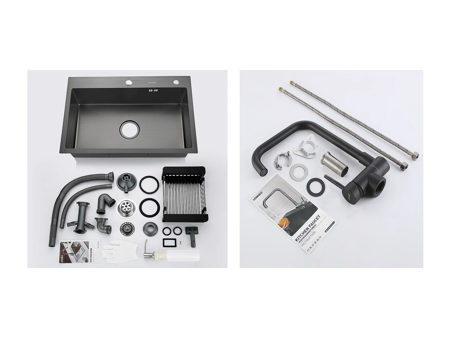 2 in 1 Aanrecht Zwart 68x45x19CM met Zeepafvoer en Afdruiprek Mand + KeukenmengkraanIne Inklapbaar Draaibaar 360° Koud Water Warm