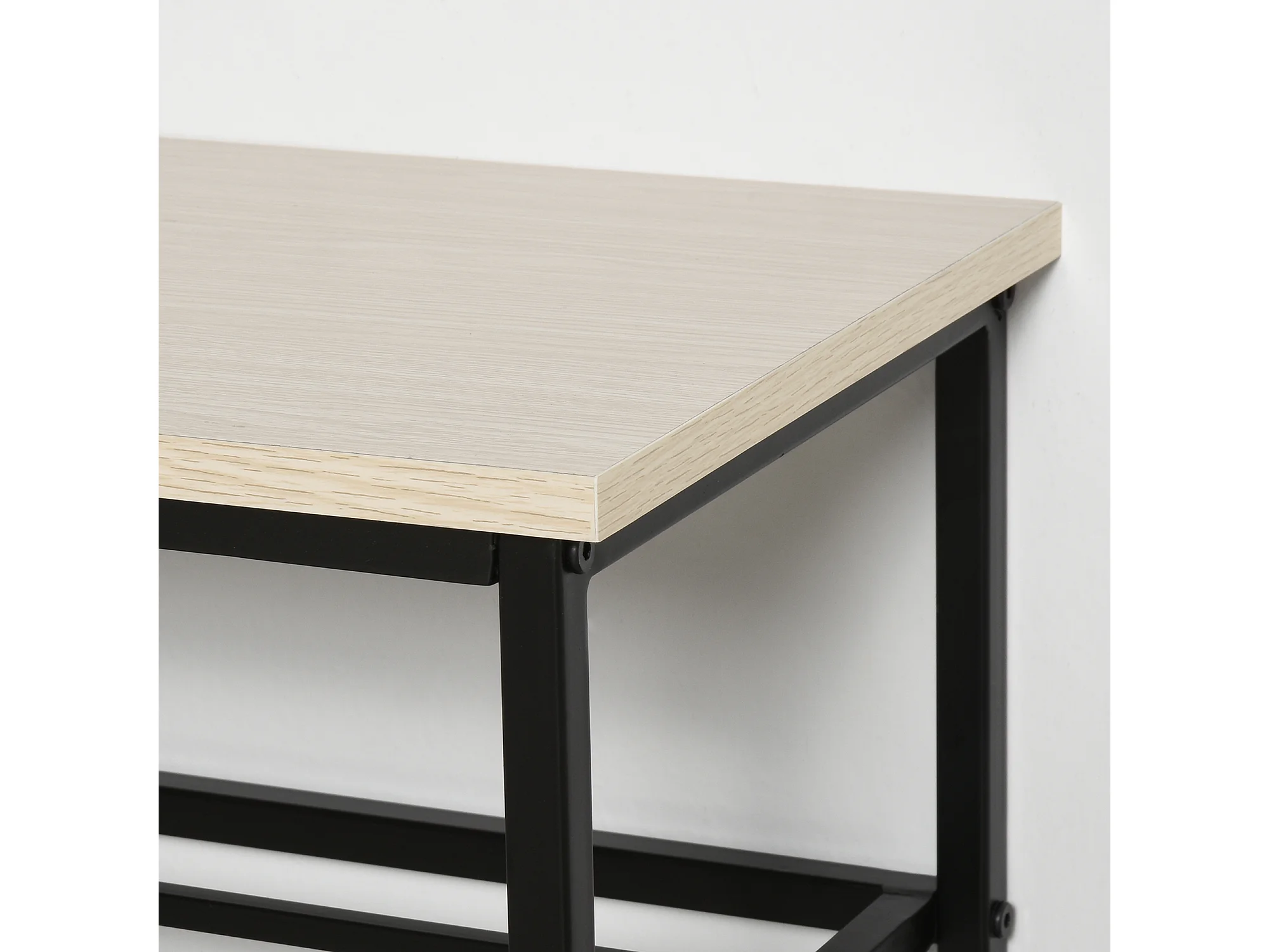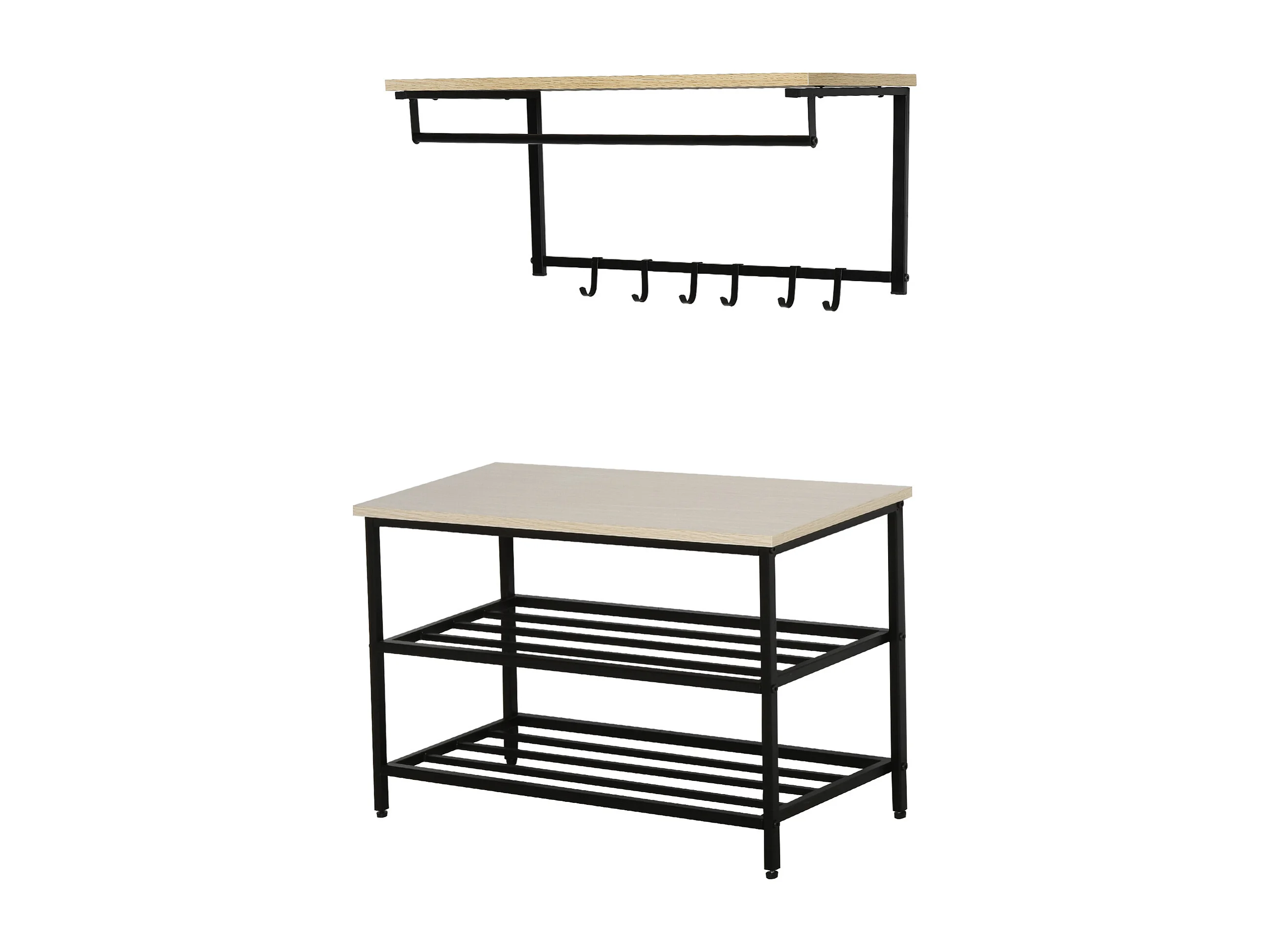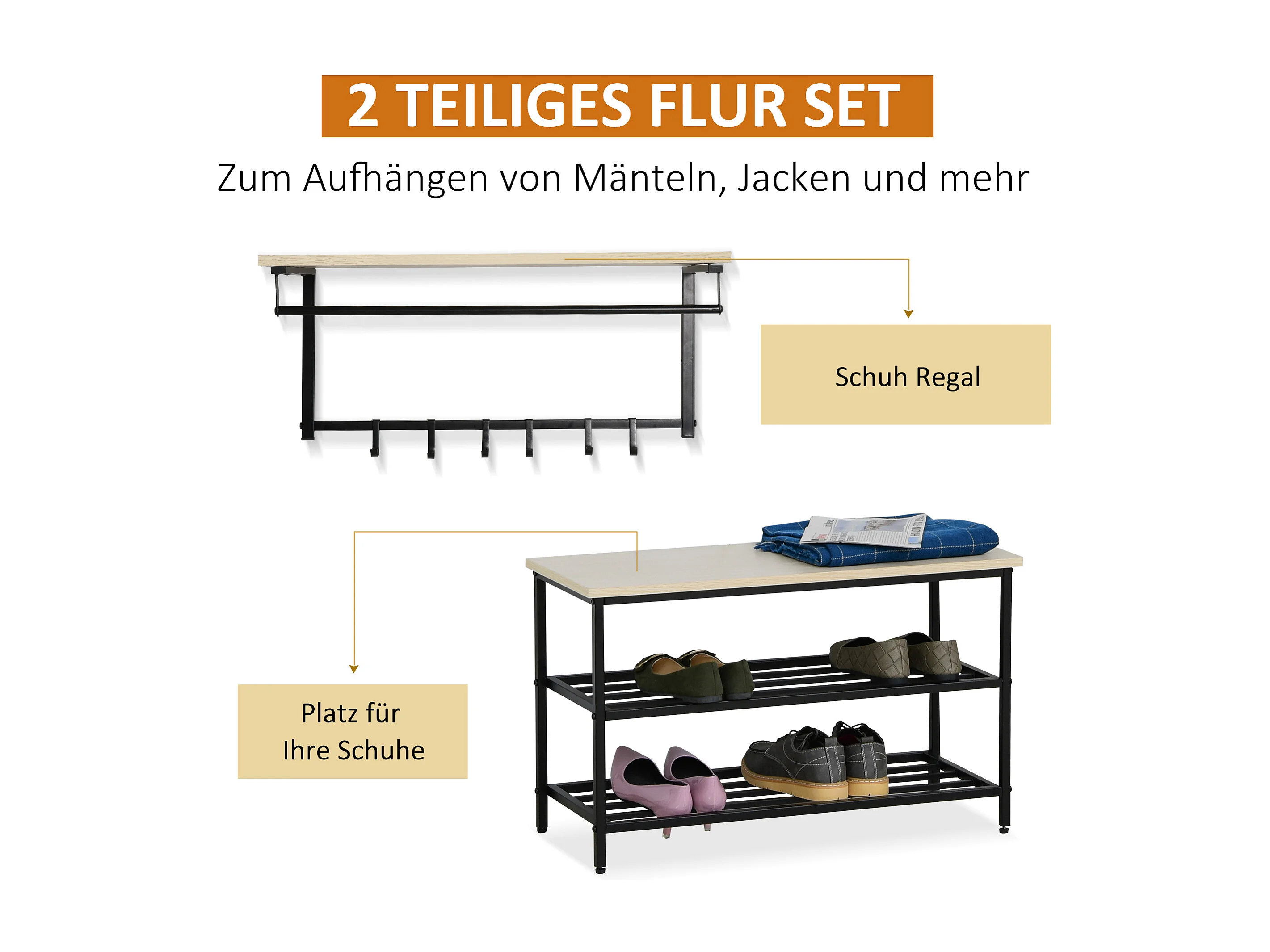 2-in-1 garderobeset met bank en wandkapstok, 6 haken, natuurlijk melamine hout en zwart metaal (75x30x45cm)