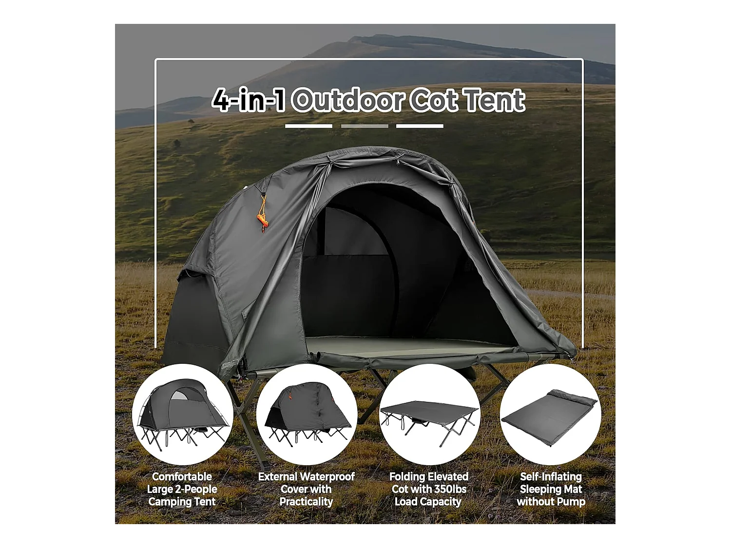 2-Persoons Kampeerbedje tent, 4-in-1 opvouwbaar tentbed, zelfopblazende matras en draagtas, draagbare verhoogde tent voor buitengebruik (Grijs)ZB32374