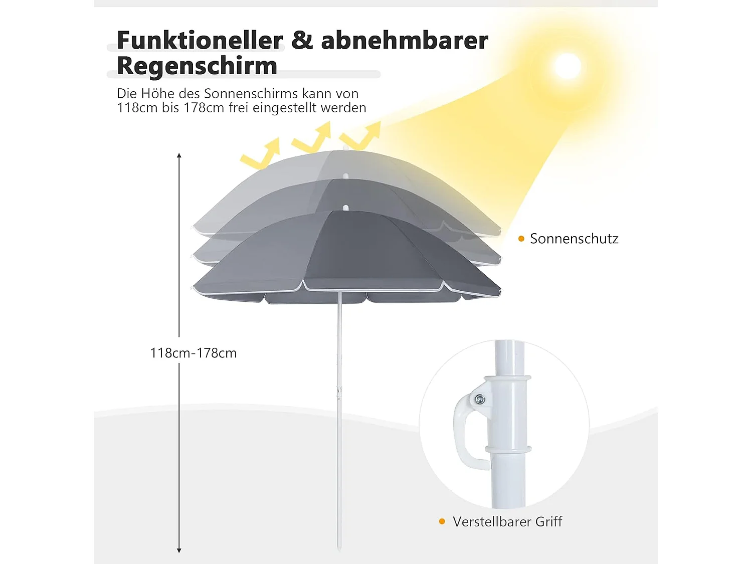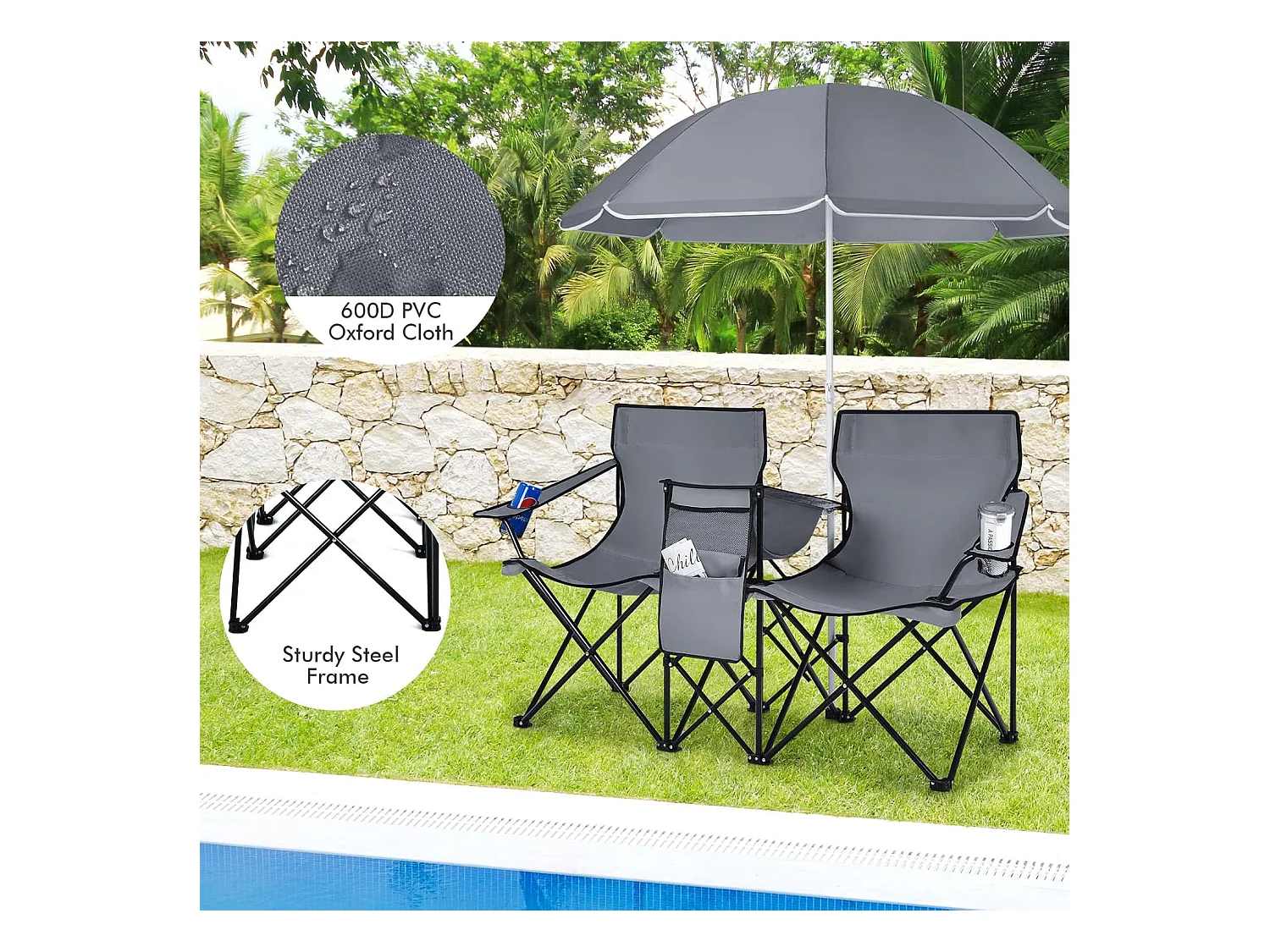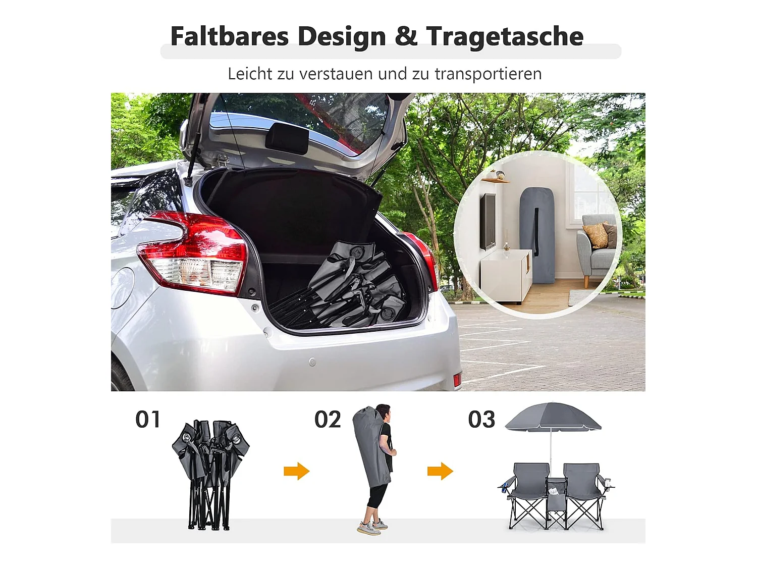 2-zits campingstoel met parasol, koeltas, bekerhouder en zijzak,inklapbare visstoel,klapstoel voor kamperen, vissen, picknick (grijs)AB92843