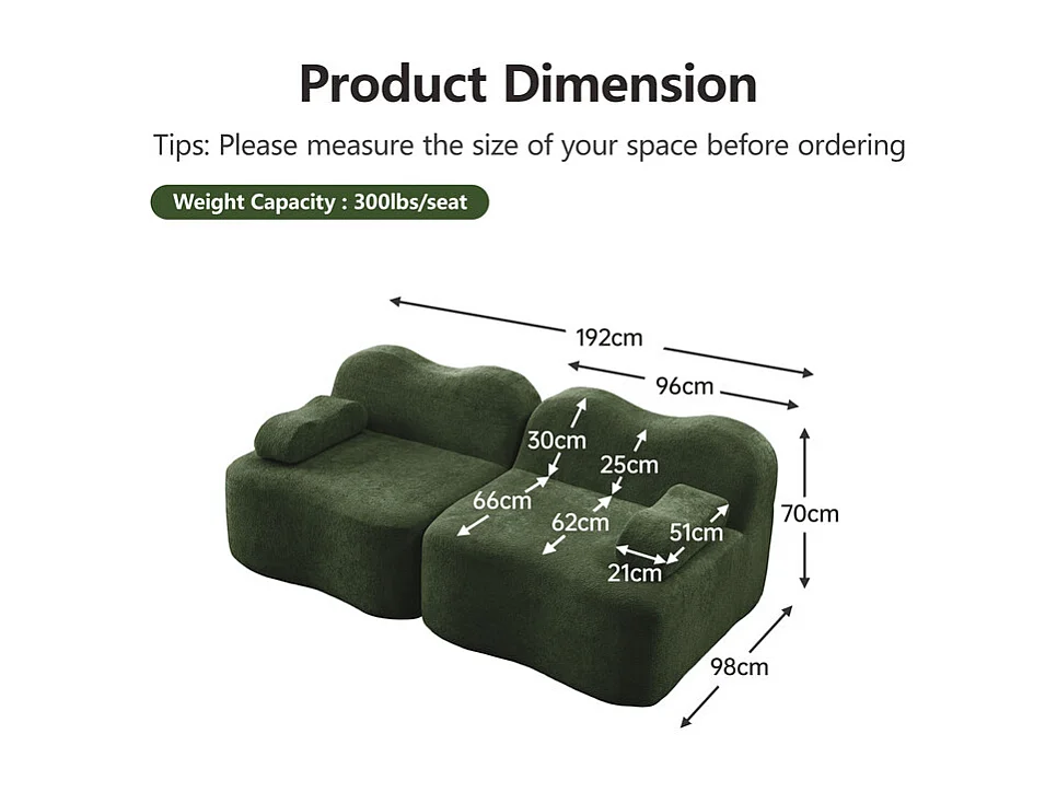 2-zits modulaire bank van fluweel, met mobiel armleuningskussen, 192x98x70cm, Groen