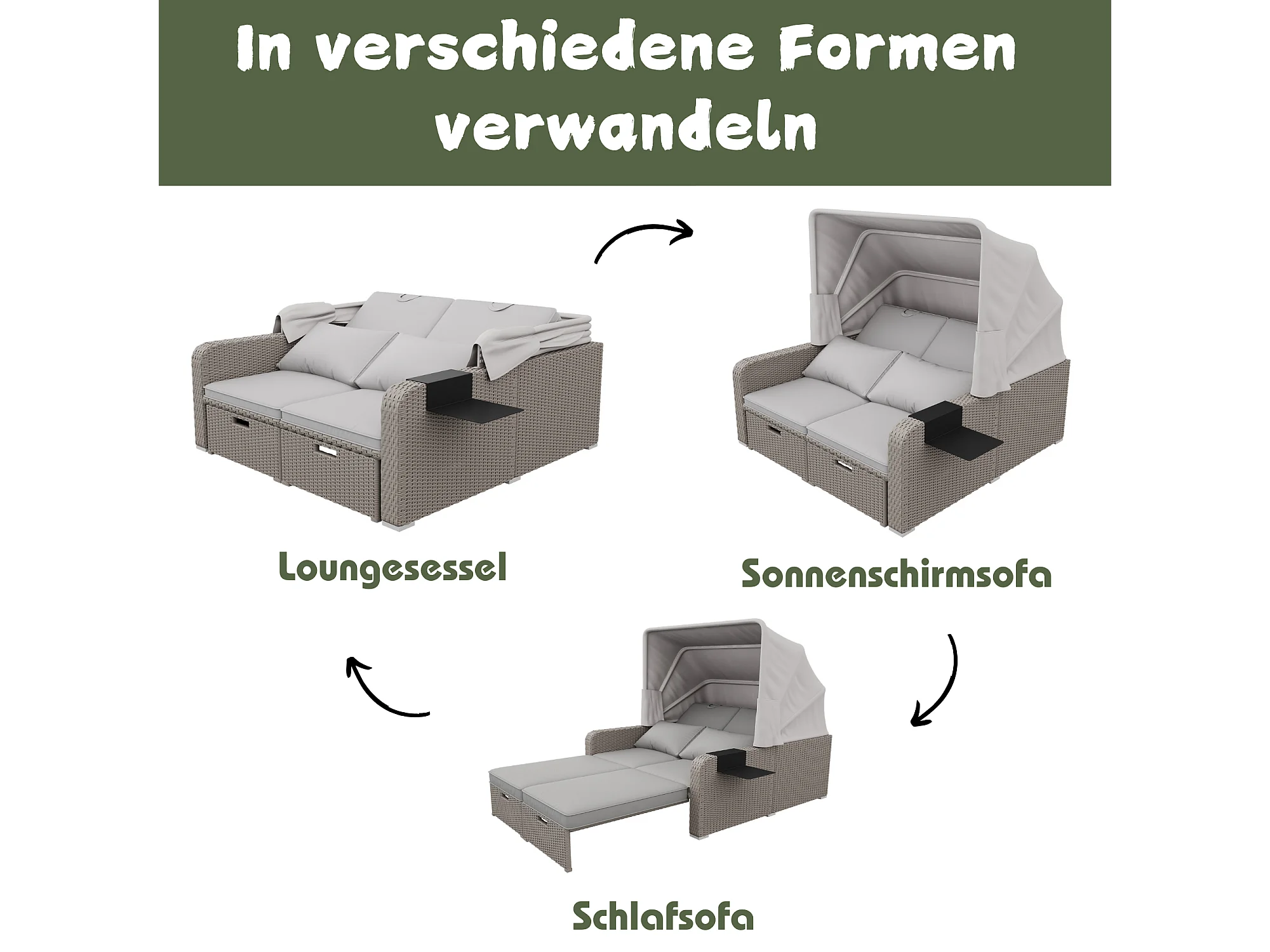 2-zits tuinbank in anti-UV geweven hars - Opvouwbaar zonnescherm - Loungebank - Kaki kleur