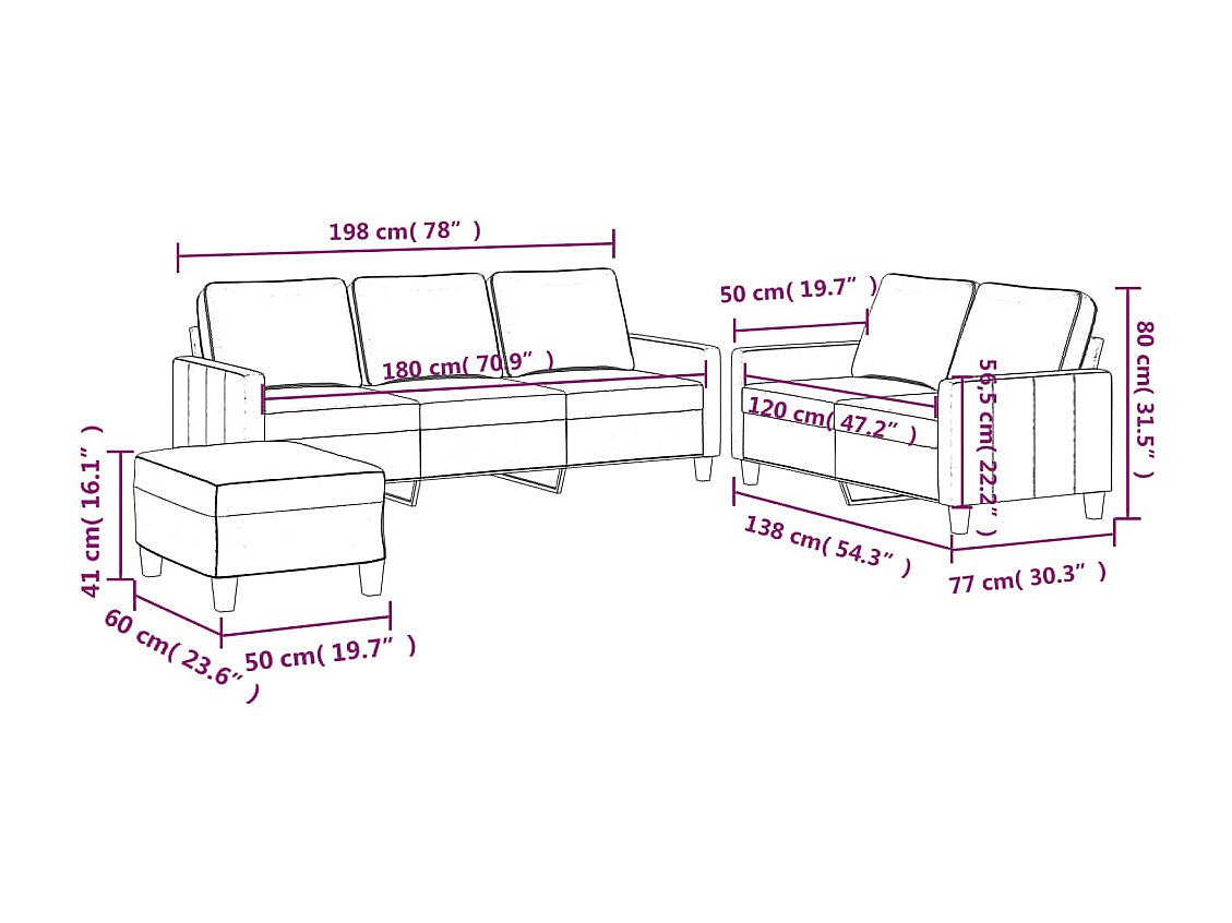 3-delige bankstel met kussens, roze fluweel