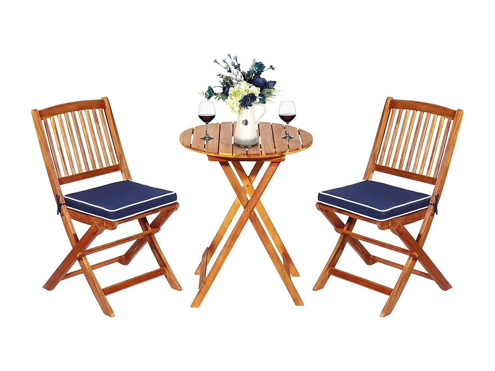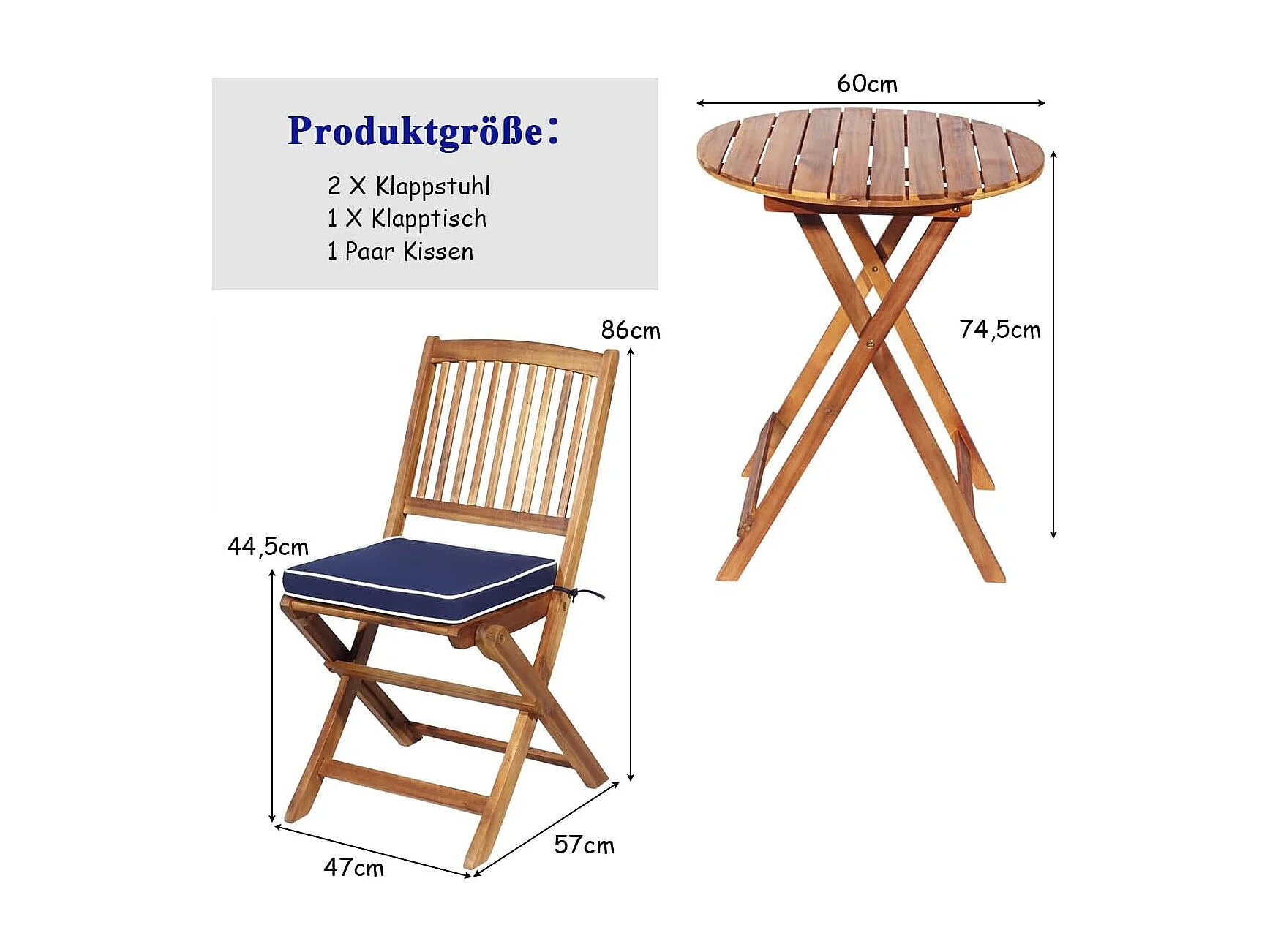3-delige terrasmeubelset, inklapbaar, met ronde tafel en 2 stoelen, ergonomische zitset van acaciahout met 2 kussens, bistroset voor balkon,achtertuin TI87097