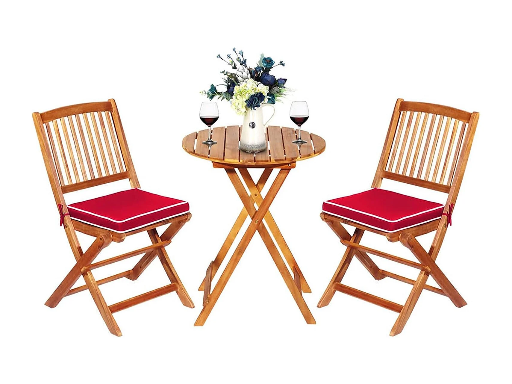 3-delige terrasmeubelset, inklapbaar,met ronde tafel en 2 stoelen,ergonomische zitset van acaciahout met 2 kussens, bistroset voor balkon, tuin, terras,roodTI87097