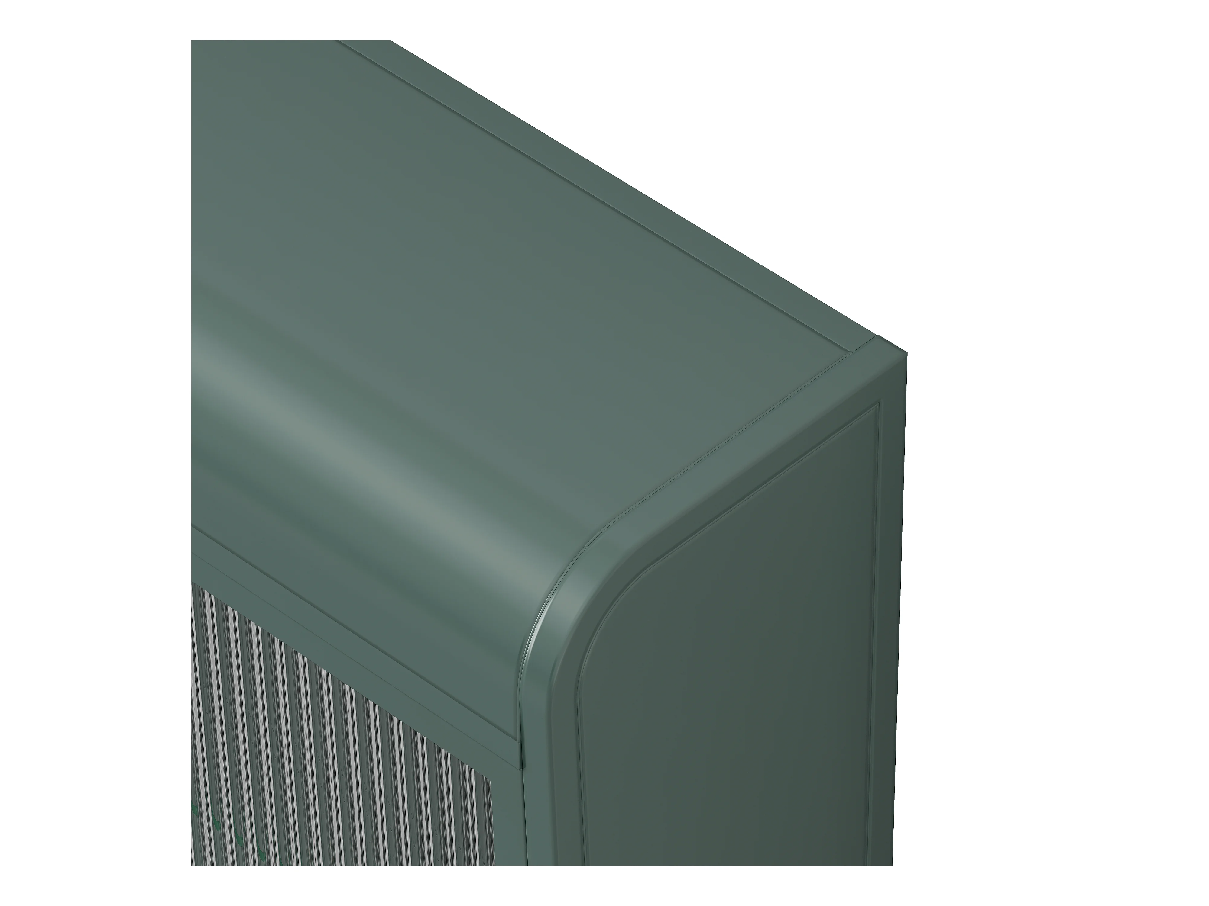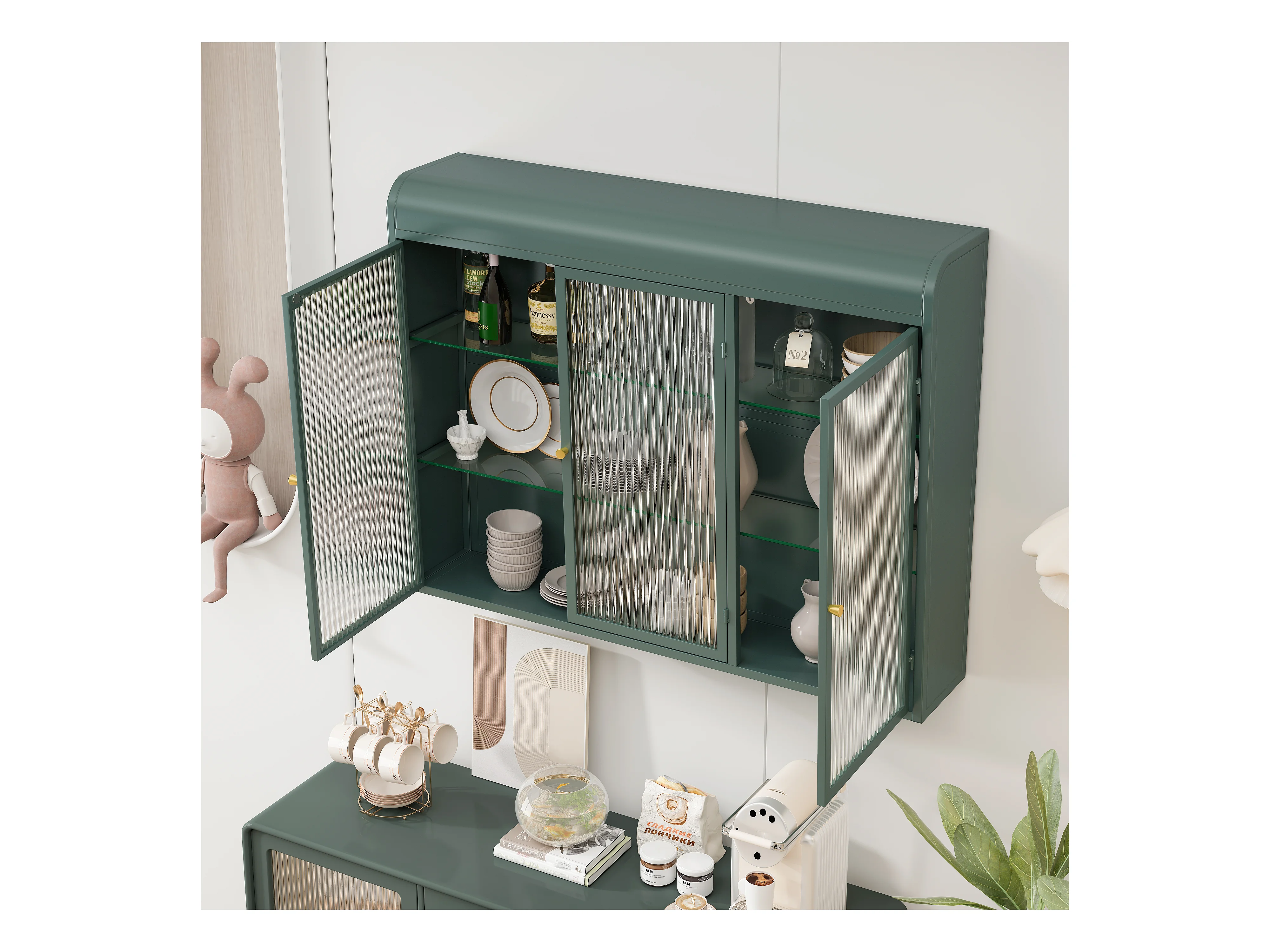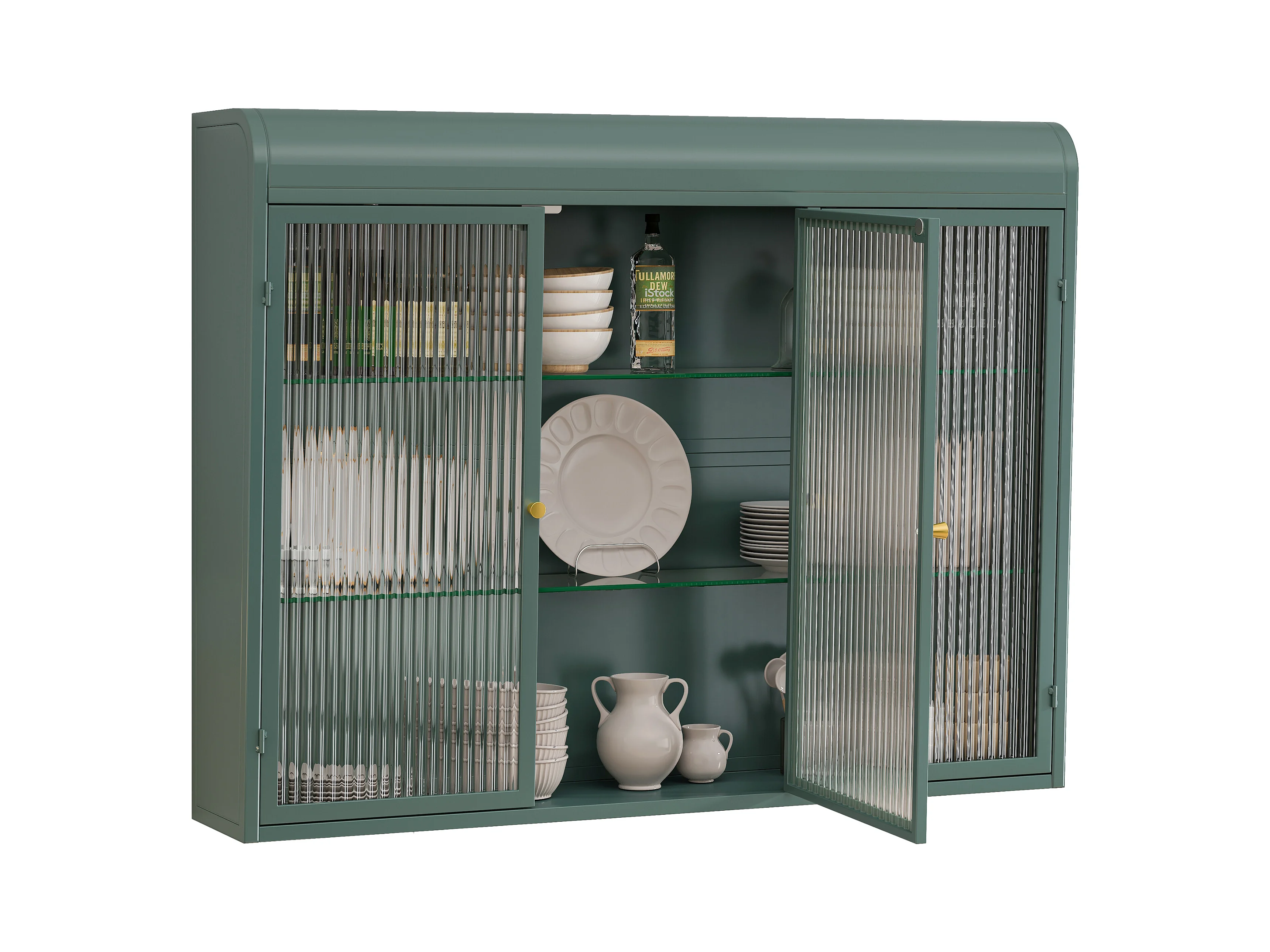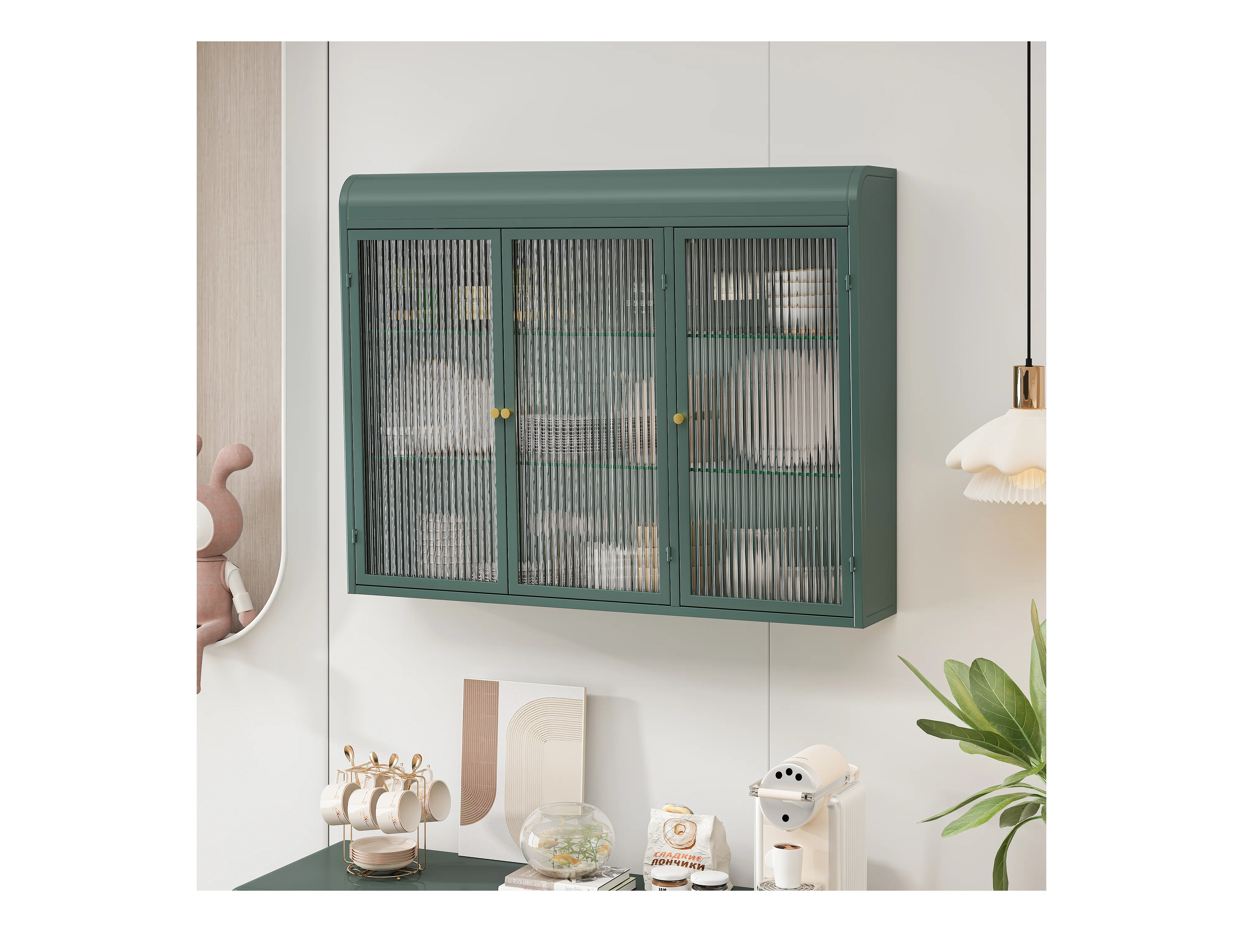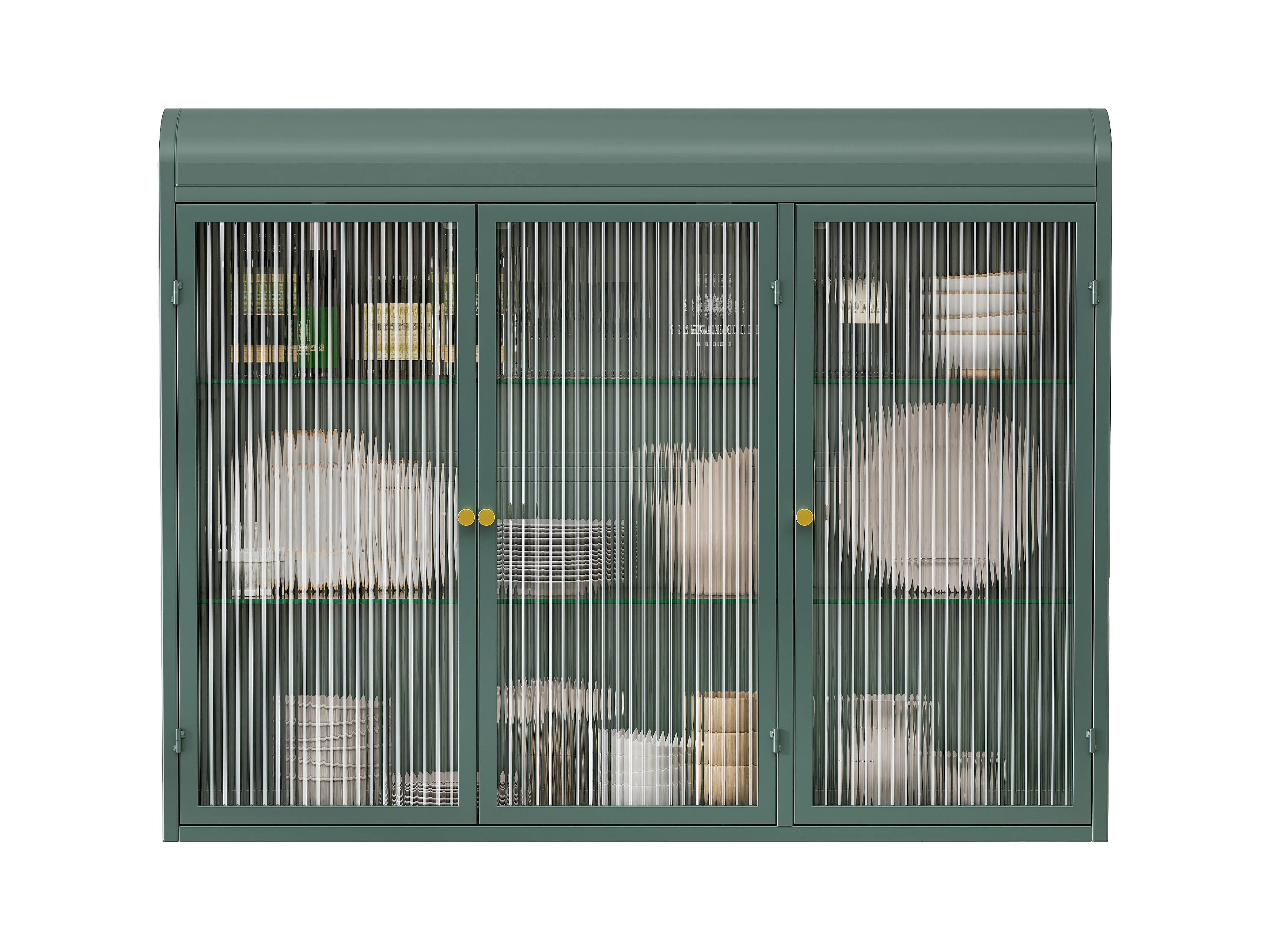 3-deurs wandkast, gebogen design, glazen front met metalen frame, voor keuken, woonkamer en badkamer, donkergroen (90x20x70 cm)