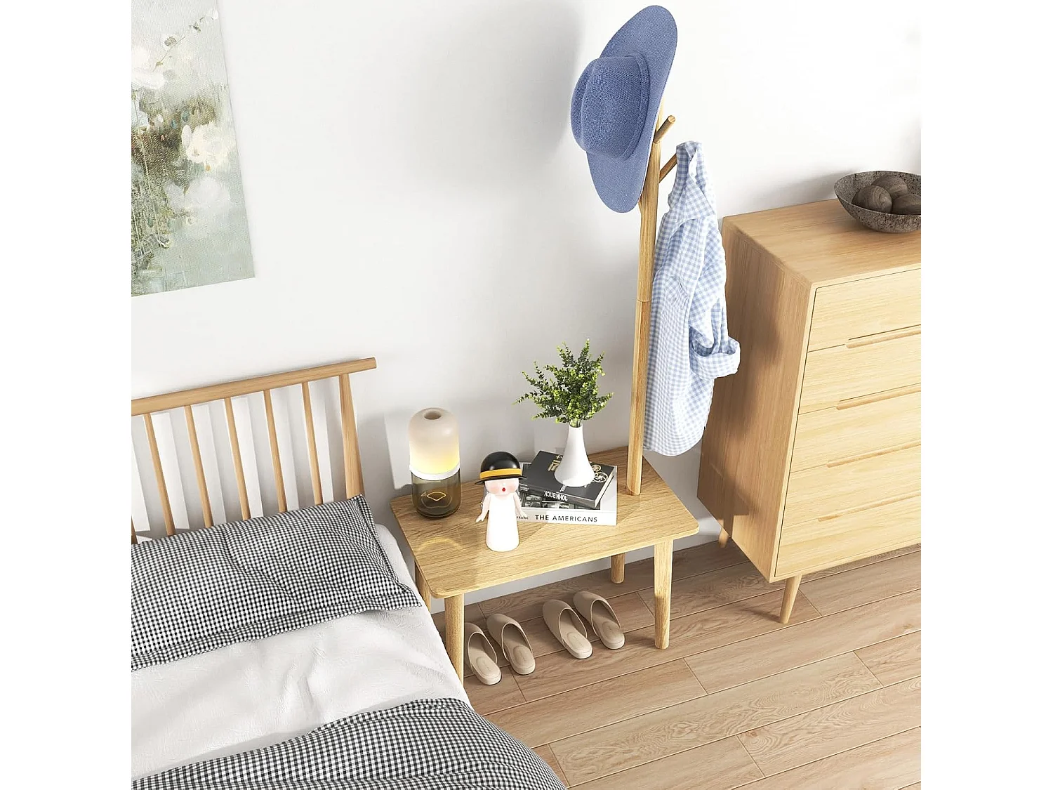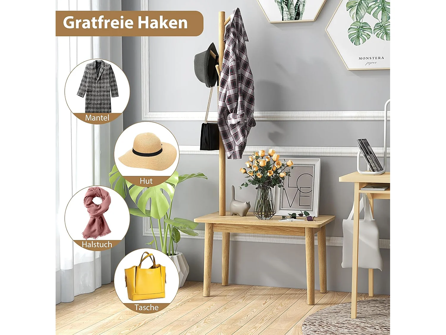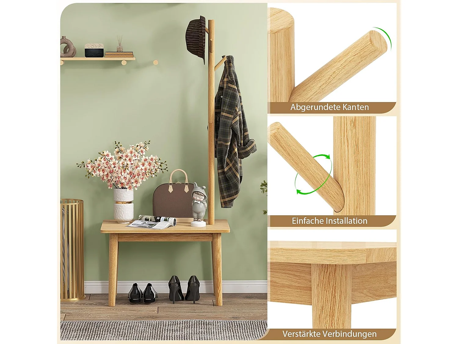 3-in-1 bijzettafel van massief hout, kapstok met schoenenbank en 3 haken, vrijstaande kledingstandaard, multifunctioneel voor slaapkamer, woonkamer(natuur)VH33674