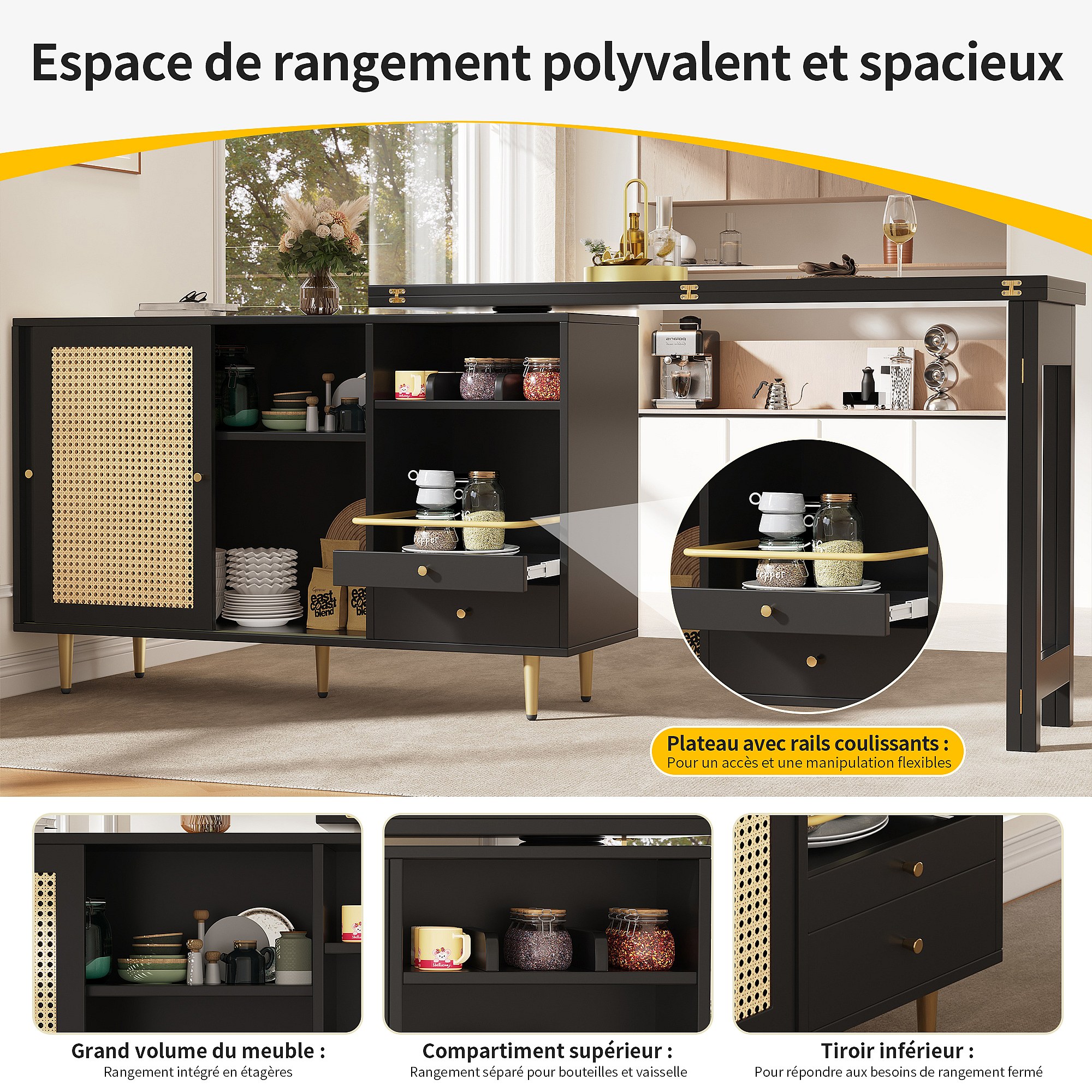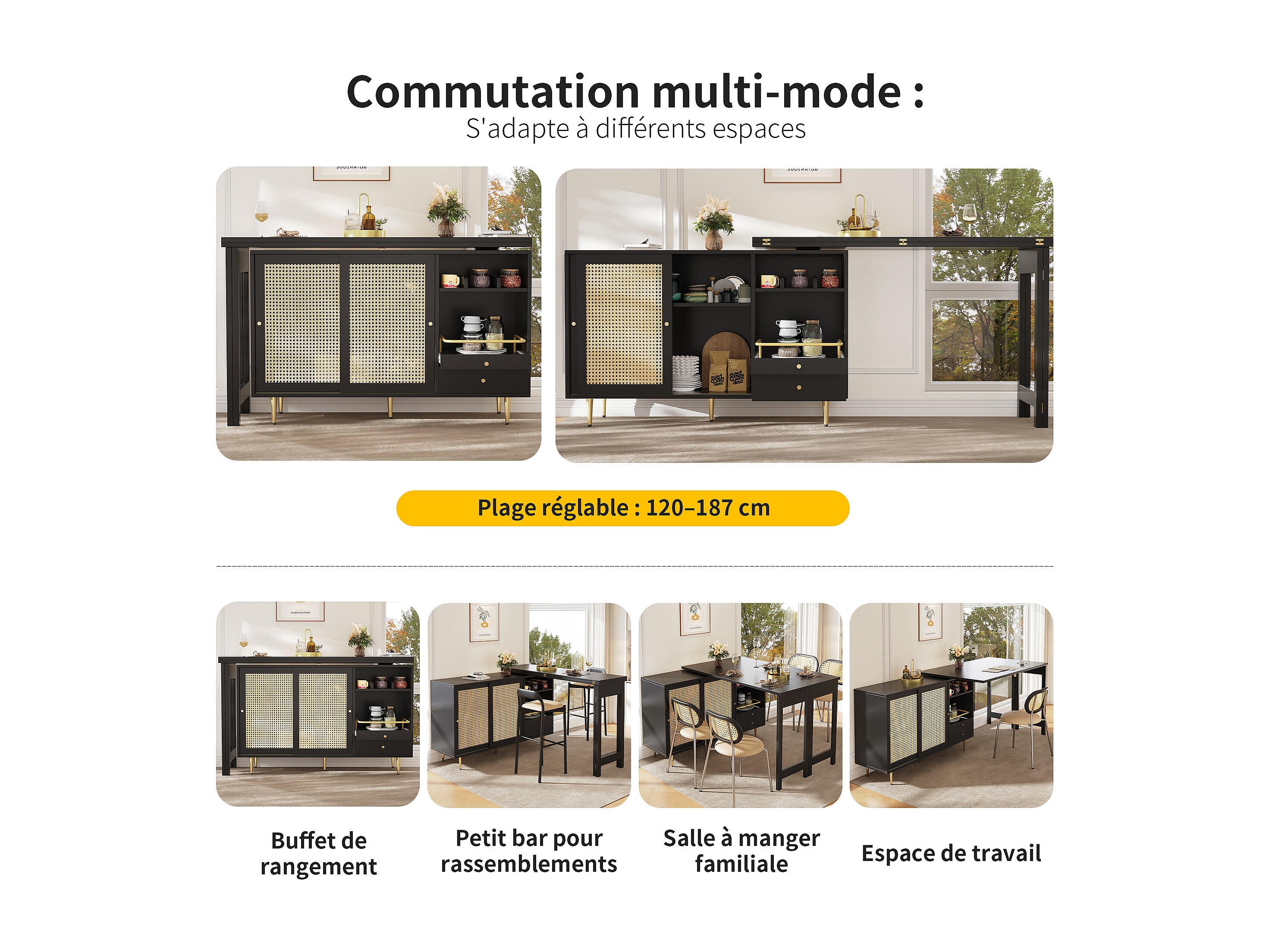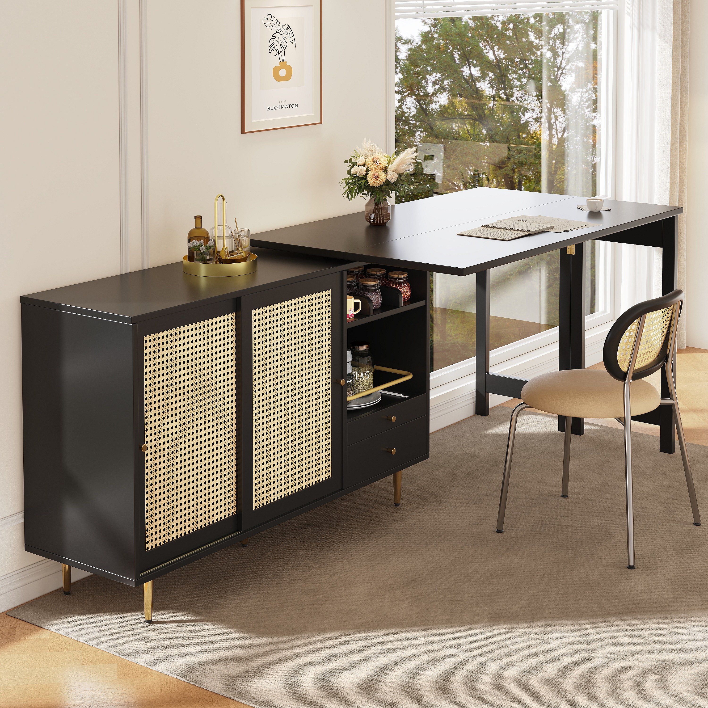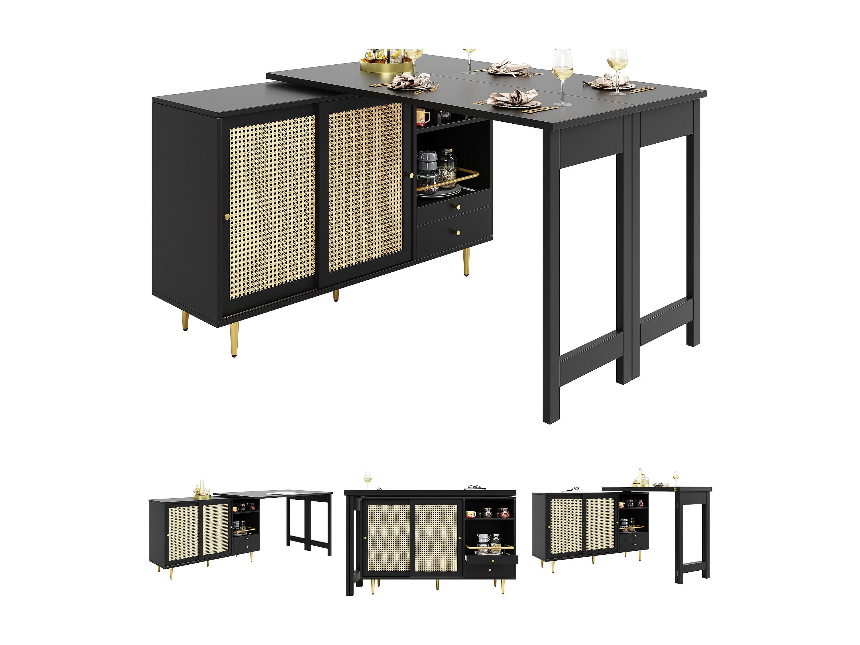 360° draaibare hoge tafel – Zwarte uitschuifbare designtafel met rotandeur en open plank – Ideaal voor keuken en eetkamer
