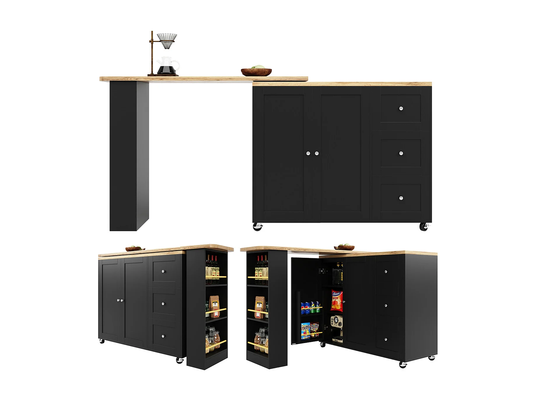 360° draaibare statafel (135-203 cm) op wielen, zwart, met 3 lades en snackhouder.