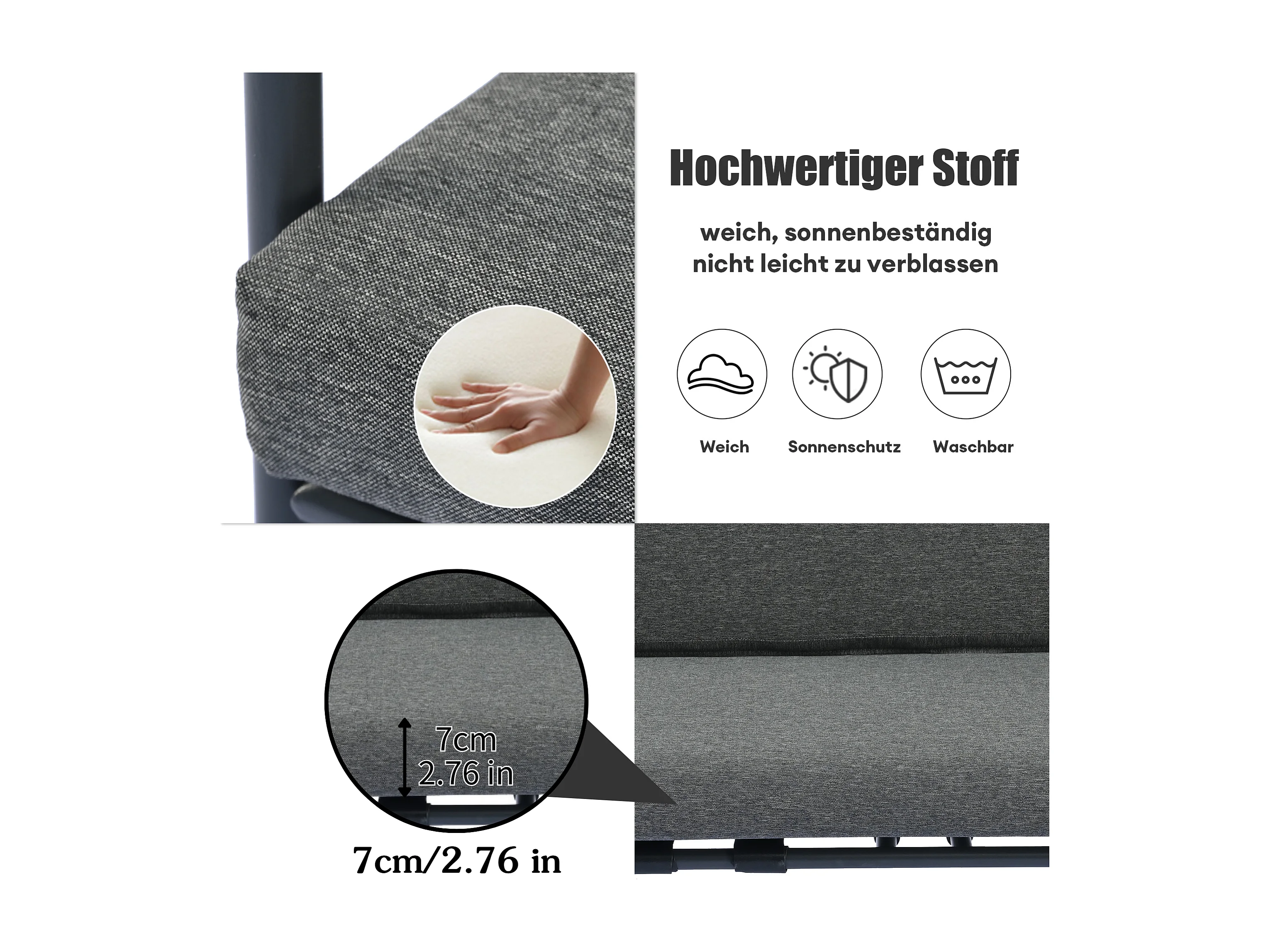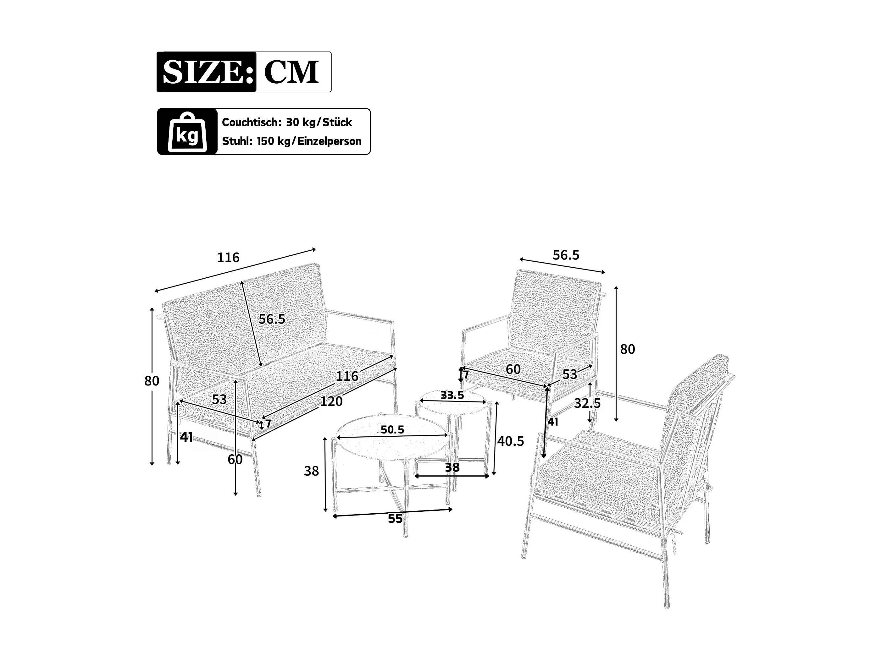 4-delige tuinbankset, 4 zitplaatsen + 2 ronde salontafels, afneembare en wasbare kussens, grijs
