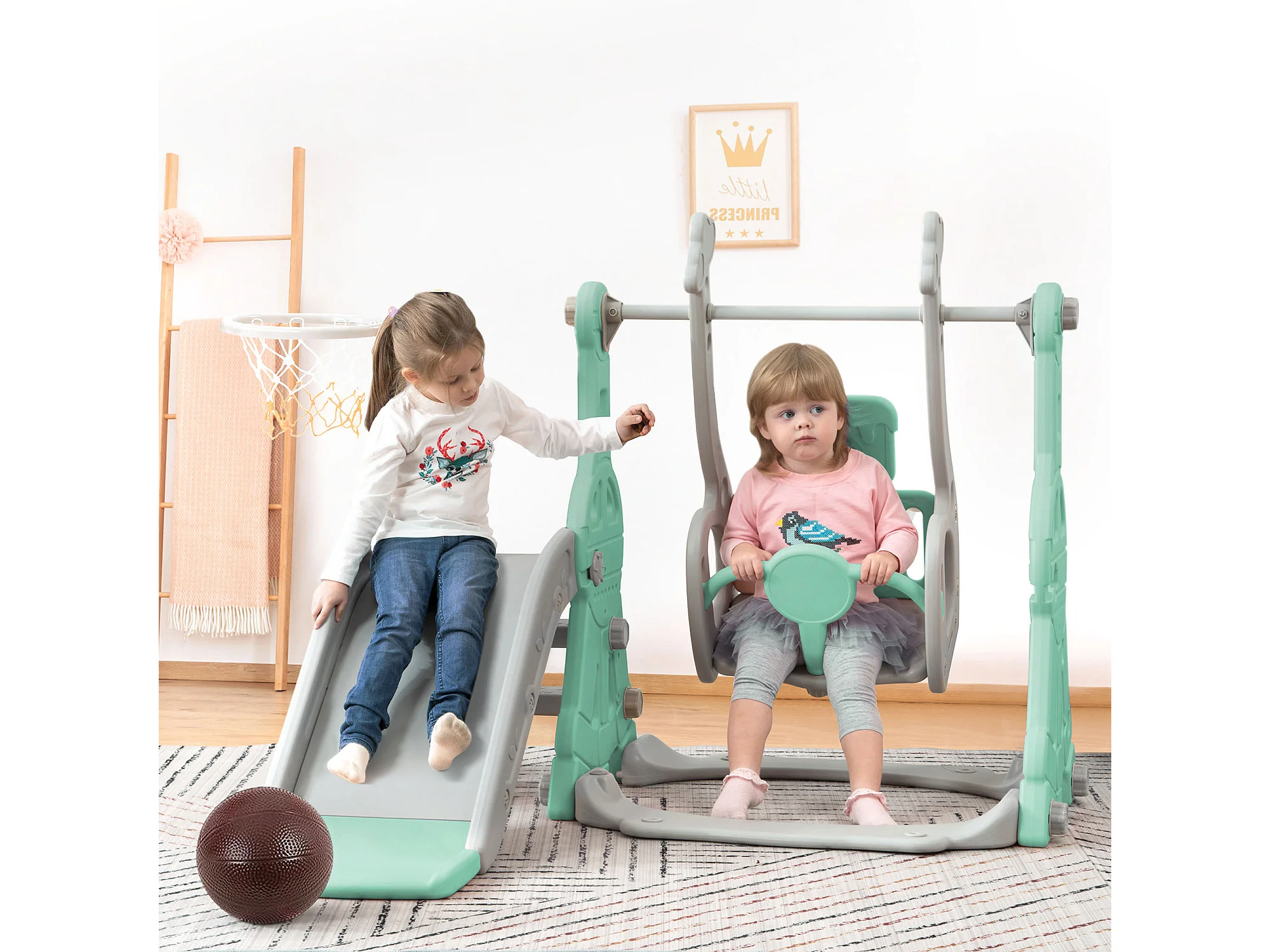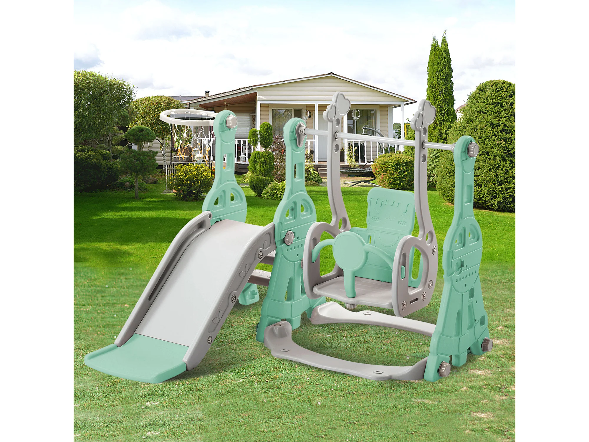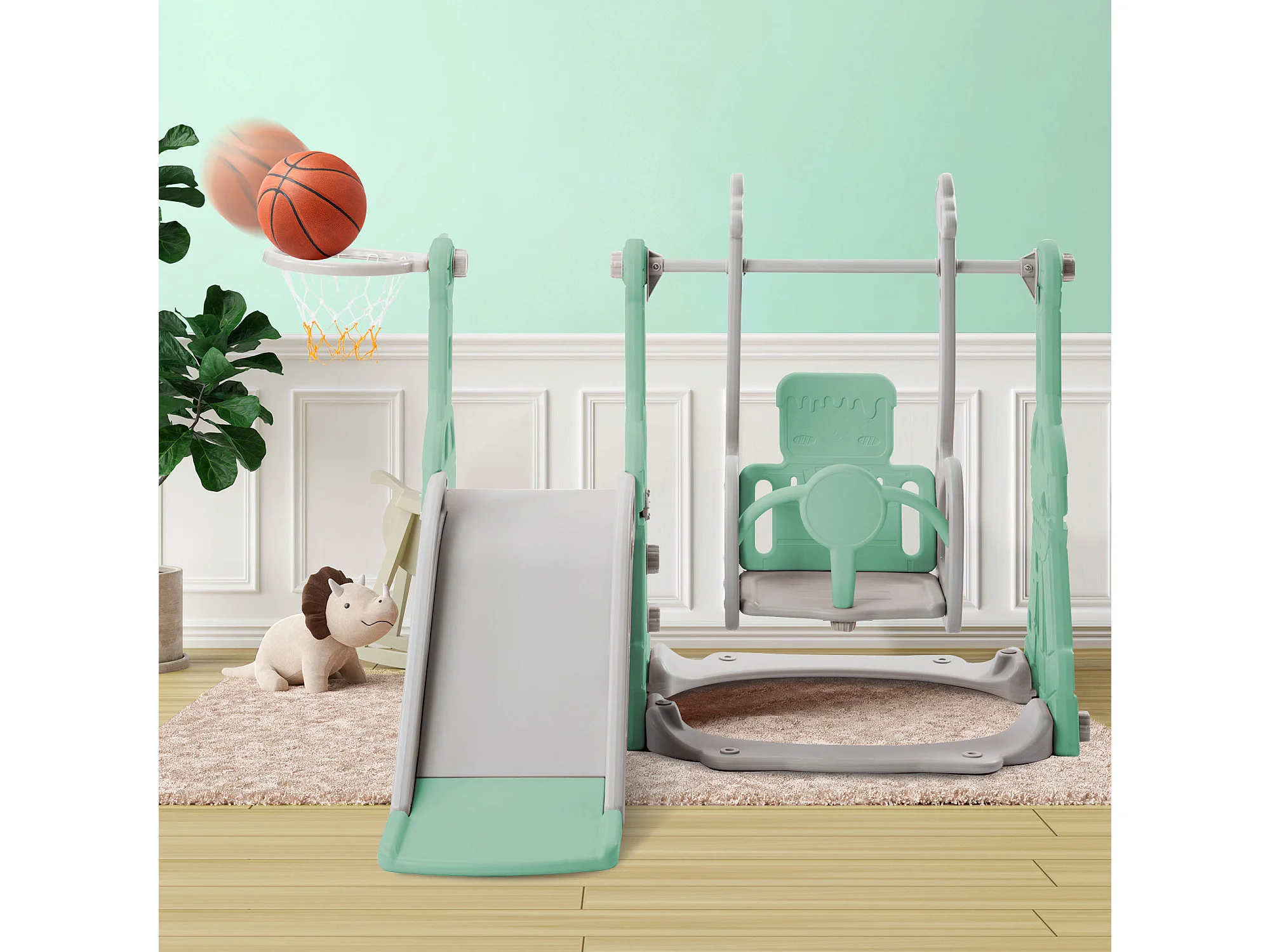 4-in-1 glijbaan met schommel en basketbalstandaard voor kinderen, klimladder, voor binnen en buiten, groen