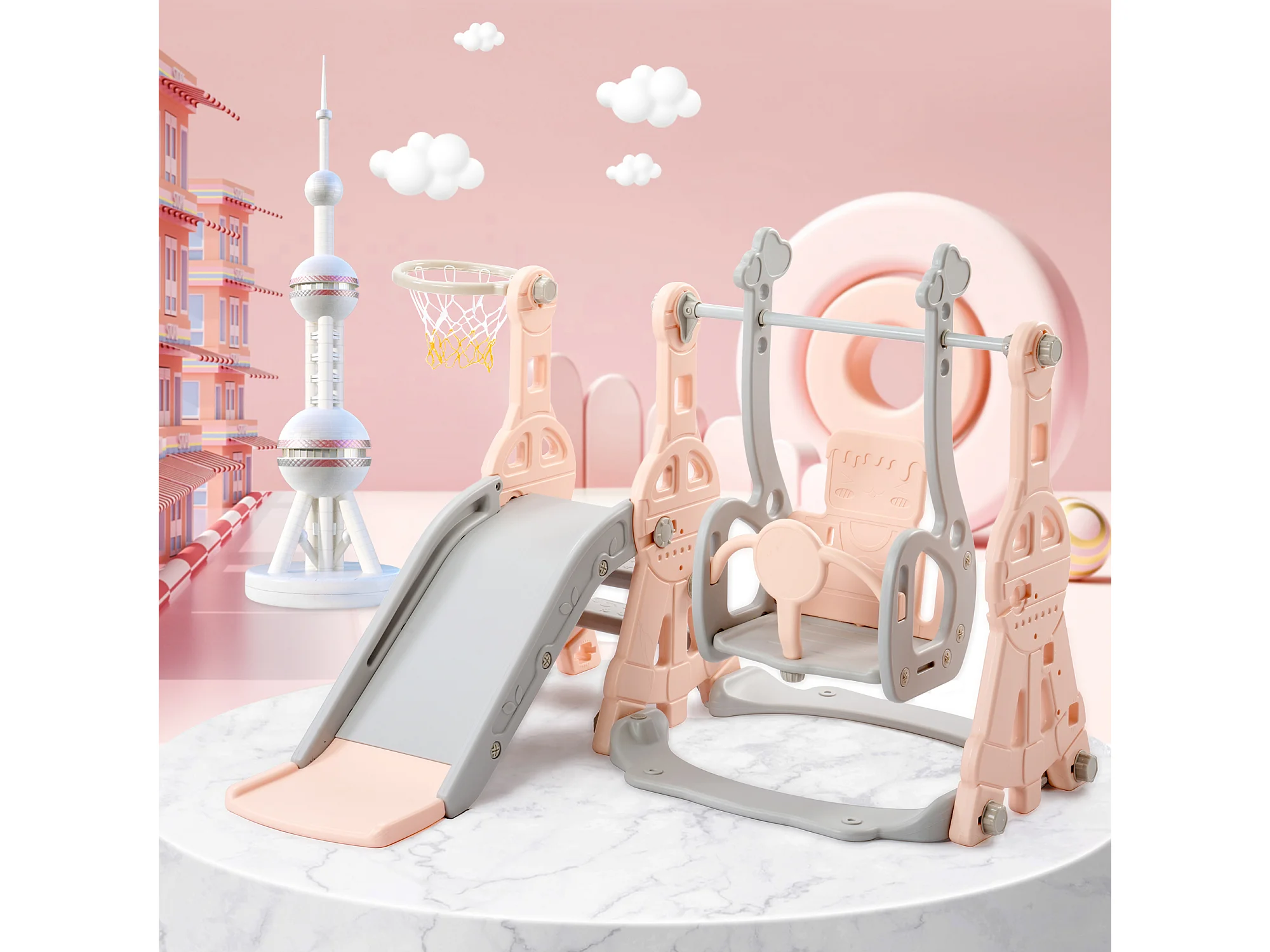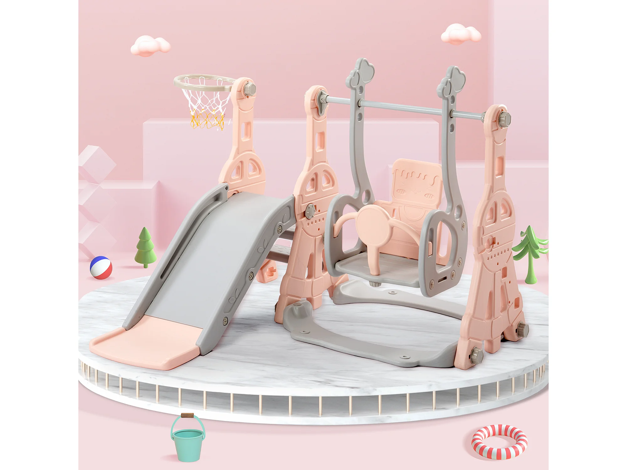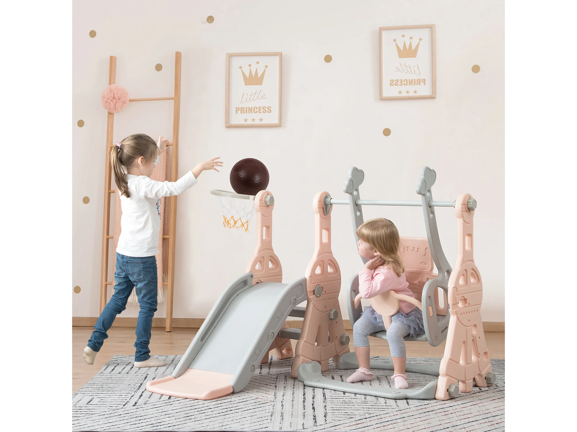 4-in-1 kinderglijbaan - 140 x 118 x 102 cm - HDPE - met schommel en basketbalstandaard - Roze