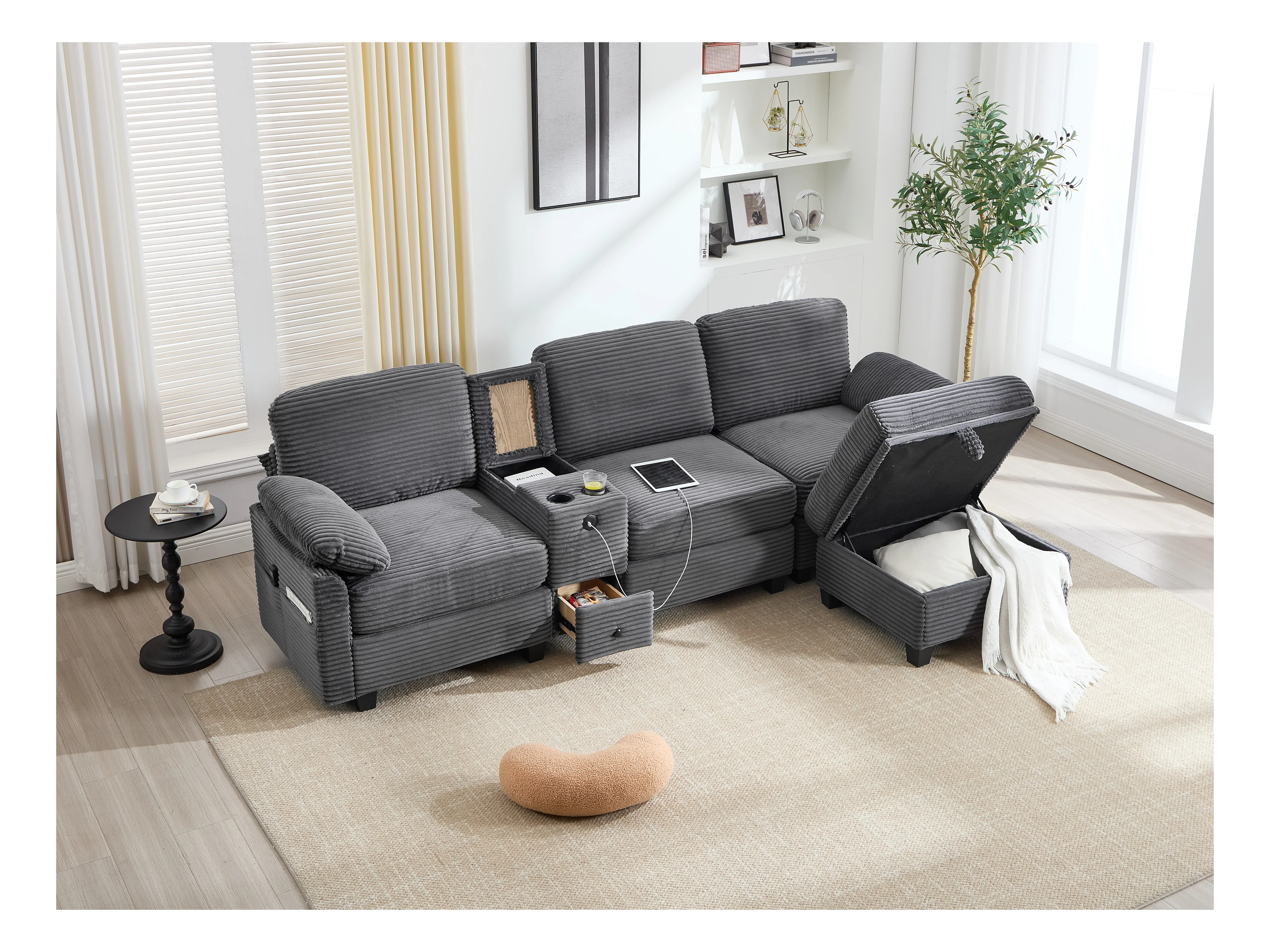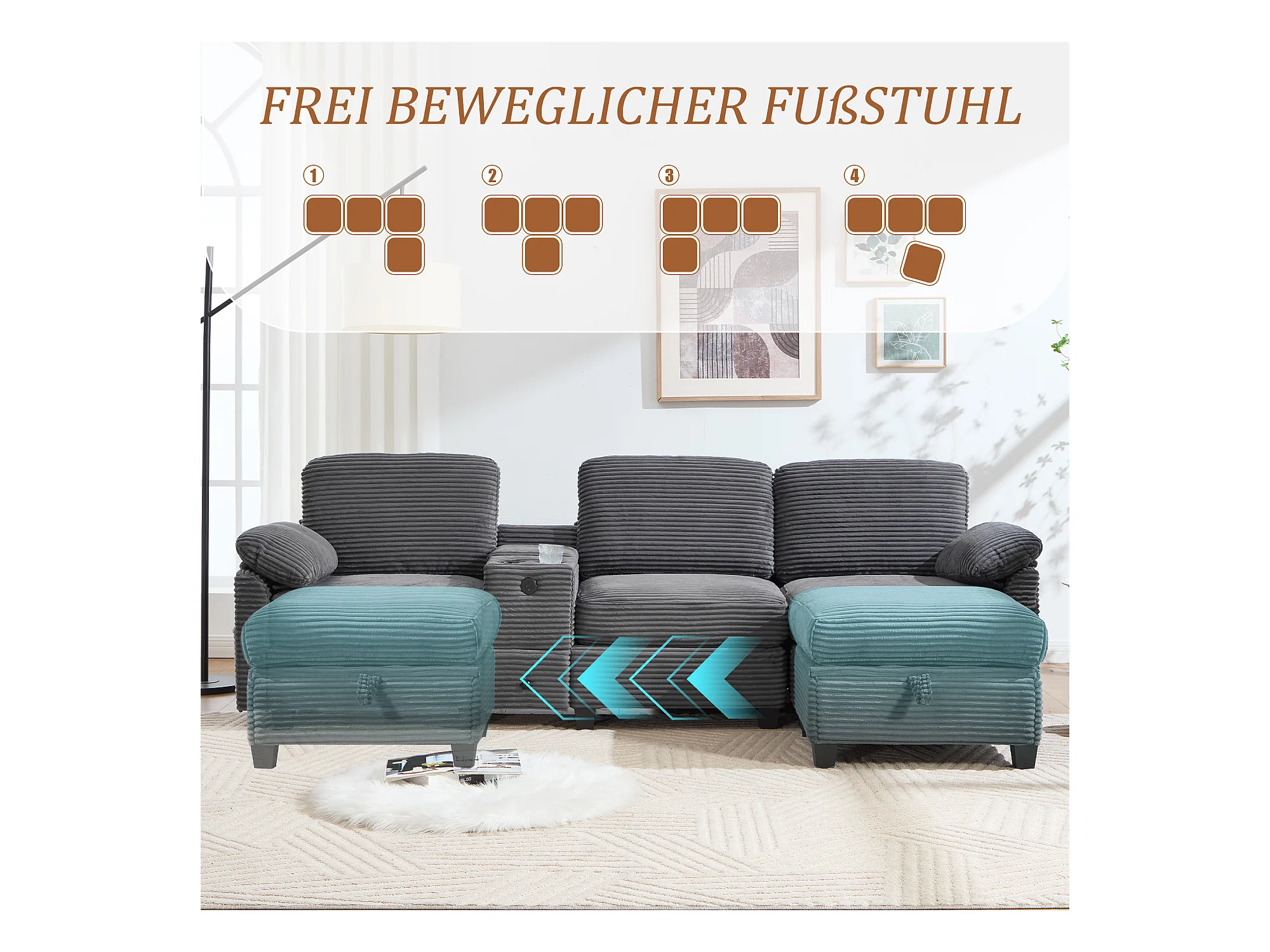 4-zits hoekbank - Modulaire bank - Middenconsole met twee USB-poorten (USB + Type-C) - Voetensteun met opbergruimte - Voor woonkamer, kantoor