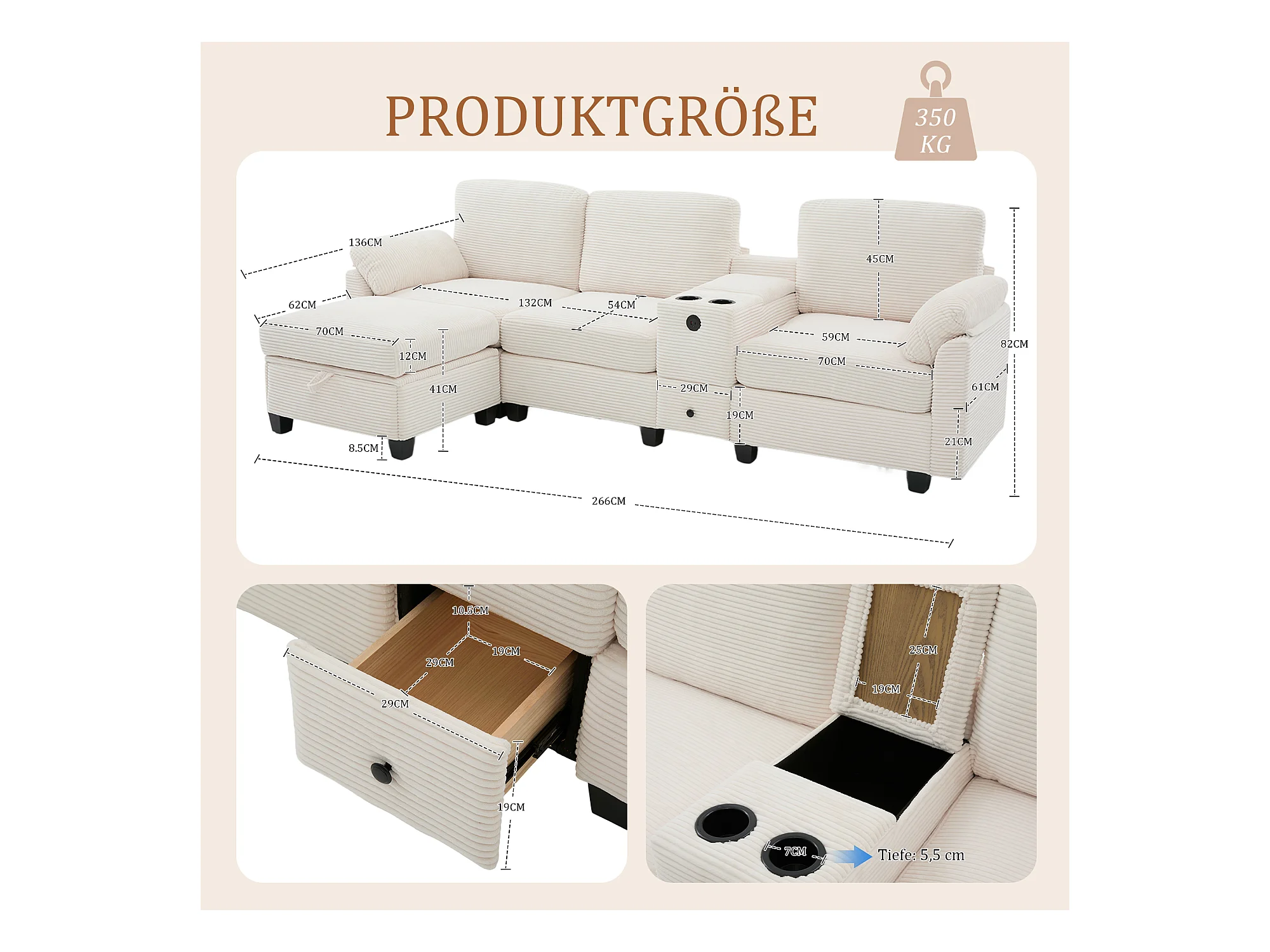 4-zits hoekbank - Modulaire bank - Middenconsole met twee USB-poorten (USB + Type-C) - Voetensteun met opbergruimte - Voor woonkamer, kantoor