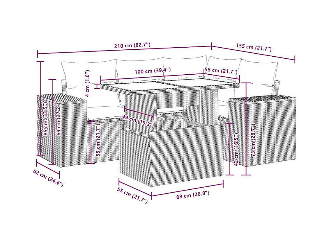 5-delige Loungeset met kussens poly rattan en acaciahout beige