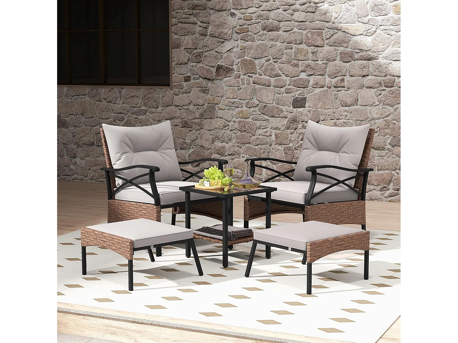 5-delige rotan tuinmeubelset, 2-traps bijzettafel, 2 stoelen met kruk, terrasmeubels, balkonmeubels 2 personen, tuingarnituur incl. zitkussens en rugkussens ZB33798