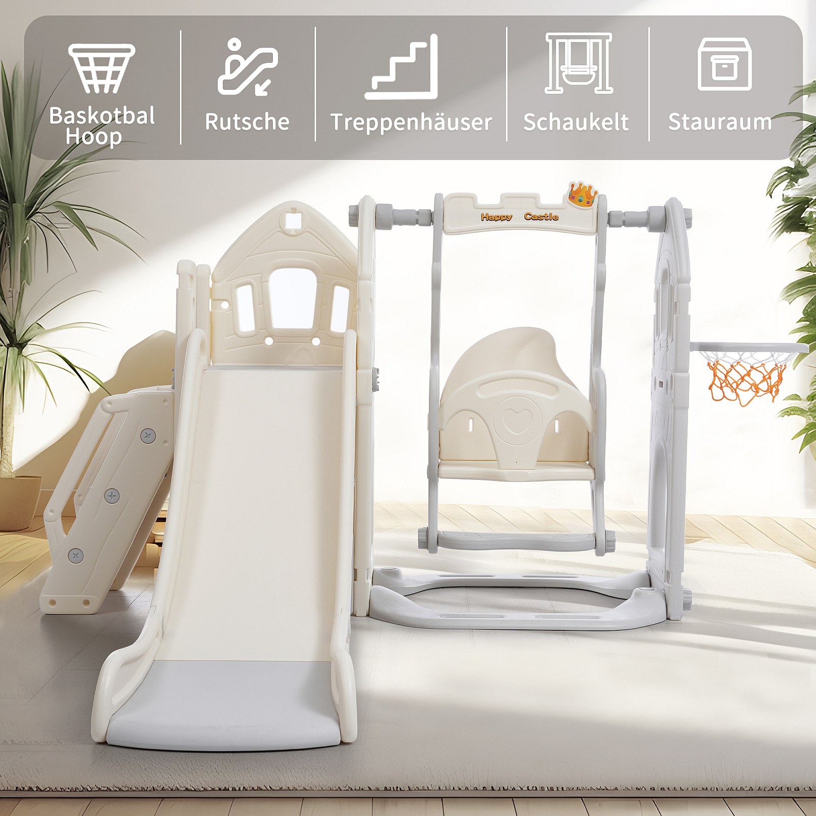 5-in-1 glijbaanset met schommel, glijbaan, klimrek, opbergruimte en basketbalring, ideaal voor gebruik binnenshuis.