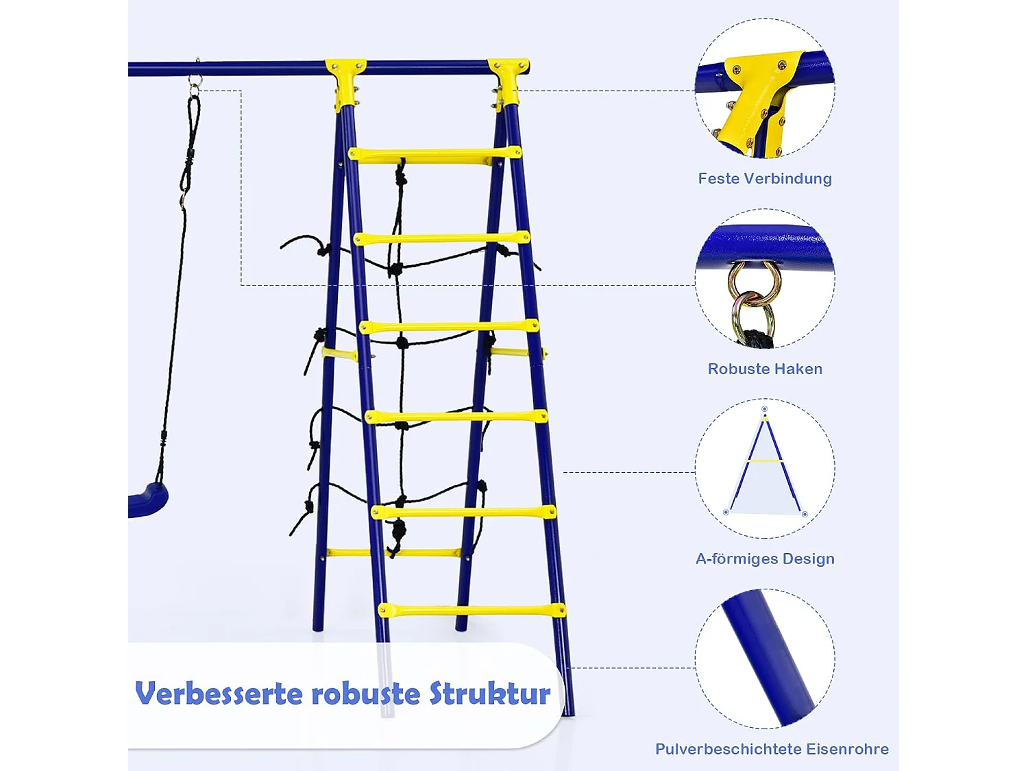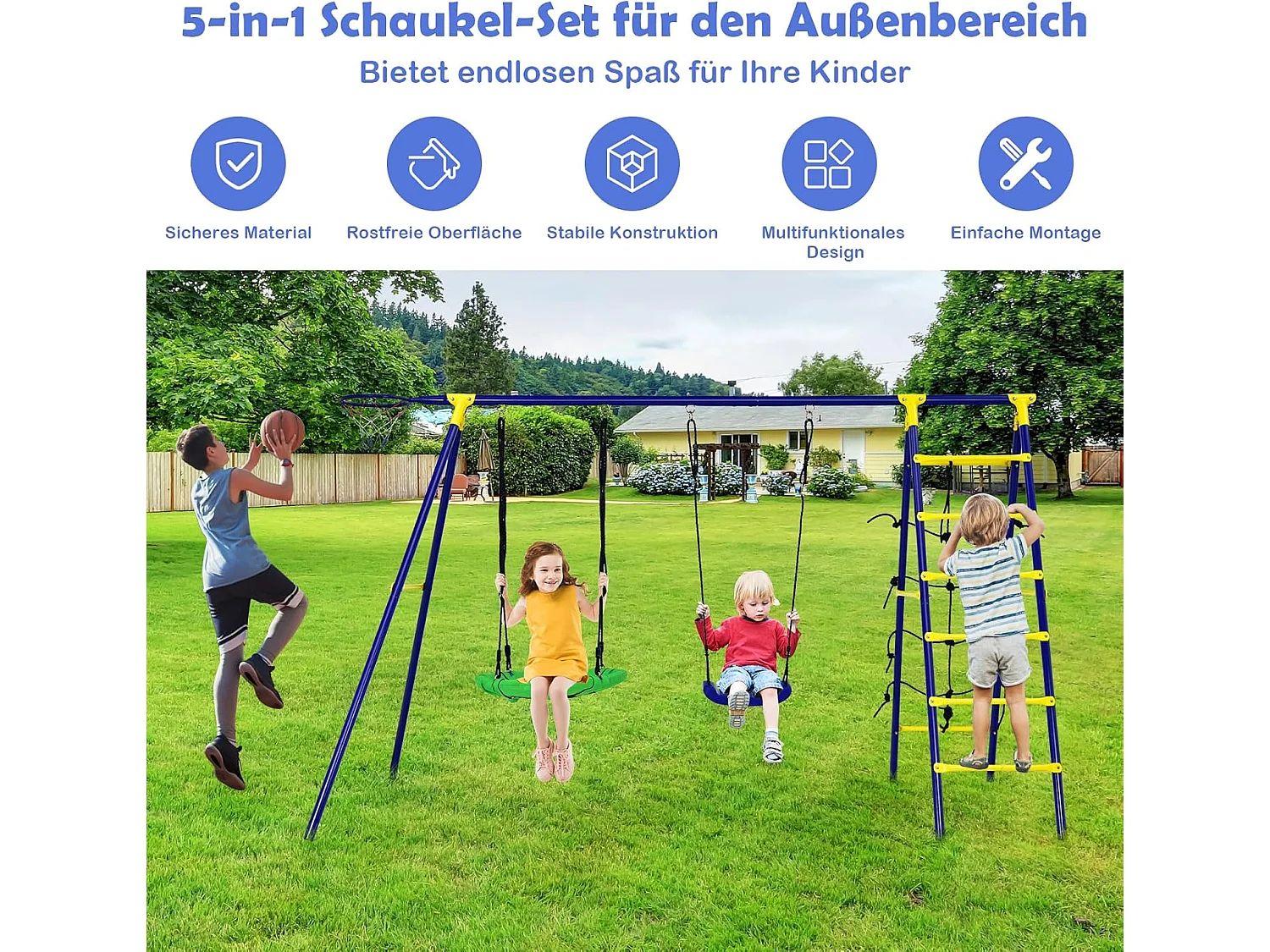 5-in-1 schommelset met 2 schommels, basketbalmand, klimnet en klimladder, kinderschommel met frame, tuinschommel, schommelframe met dubbele schommel voor tuin, erf