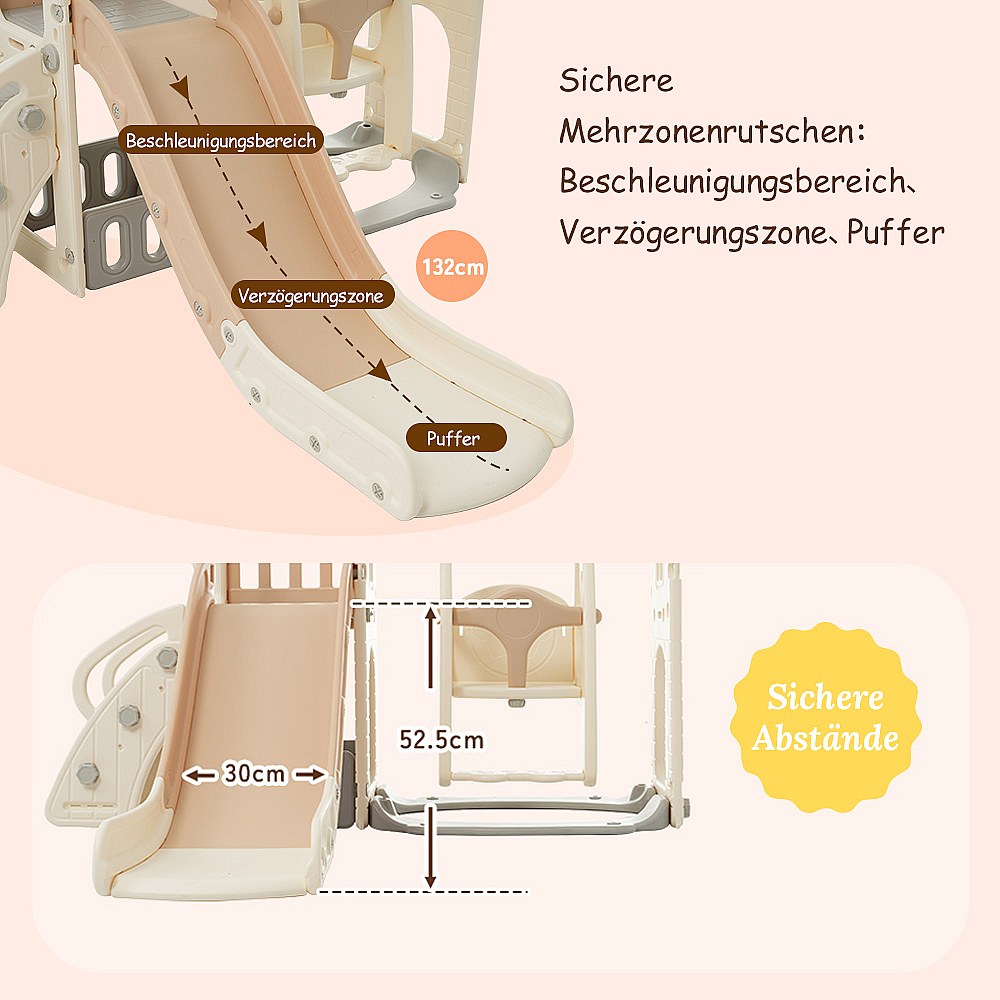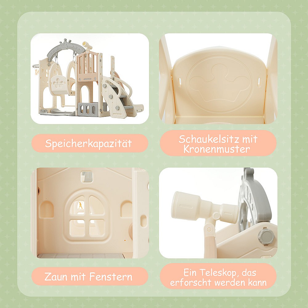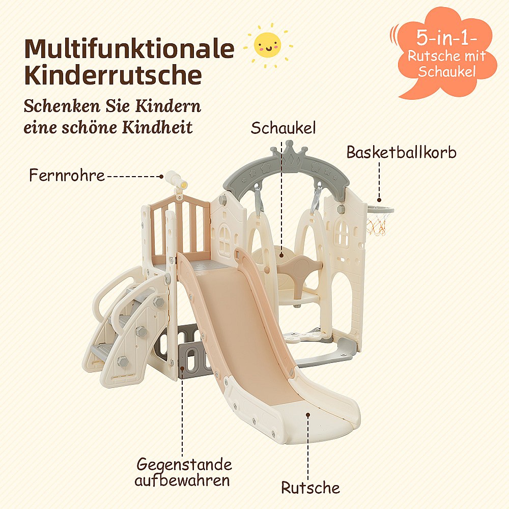 5-in-1 speeltoestel met schommel, glijbaan, ladder, mand, telescoop en opbergruimte, voor binnen- en buitengebruik.